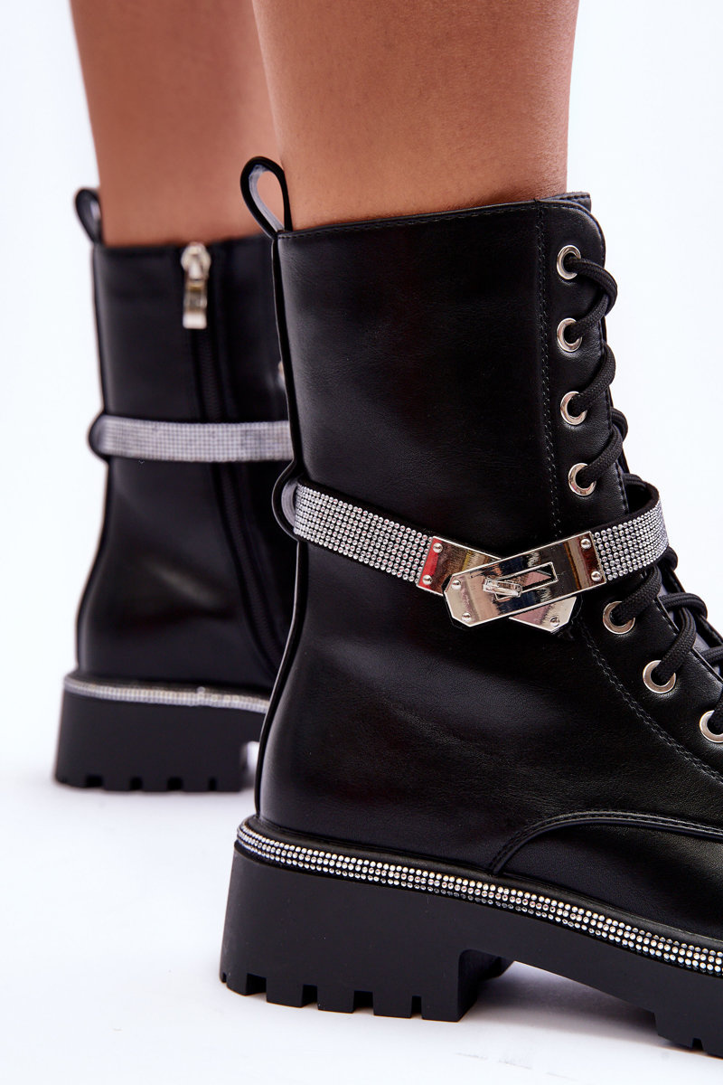 Модні жіночі черевики виготовлені з еко шкіри. Ці черевики мають внутрішній утеплювач у вигляді приємної на дотик підкладки. Модель прикрашена дрібними блискучими стразами. Ремінець на верхній частині знімний. Застібаються на блискавку, а також мають шнурівку. Плоский каблук і платформа з виїмками. Носок посилений. Ідеально підходить для багатьох стилів. Вибираючи розмір, зверніться до таблиці розмірів.
