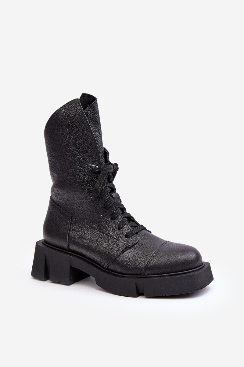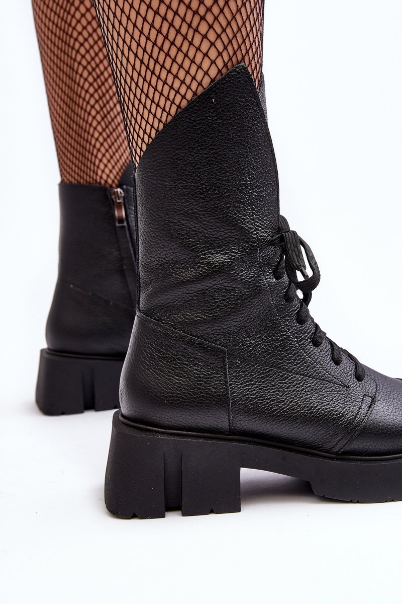 Черевики жіночі з натуральної шкіри. Встановлений на масивний плоский каблук і платформу. Застібається на блискавку. Шнурівка спереду. Нога затверділа. М'яка устілка забезпечує комфорт при використанні. Носи закруглені. Ця модна модель підійде до багатьох осінньо-зимових нарядів! При виборі розміру орієнтуйтеся на таблицю розмірів.