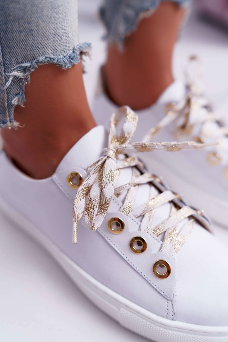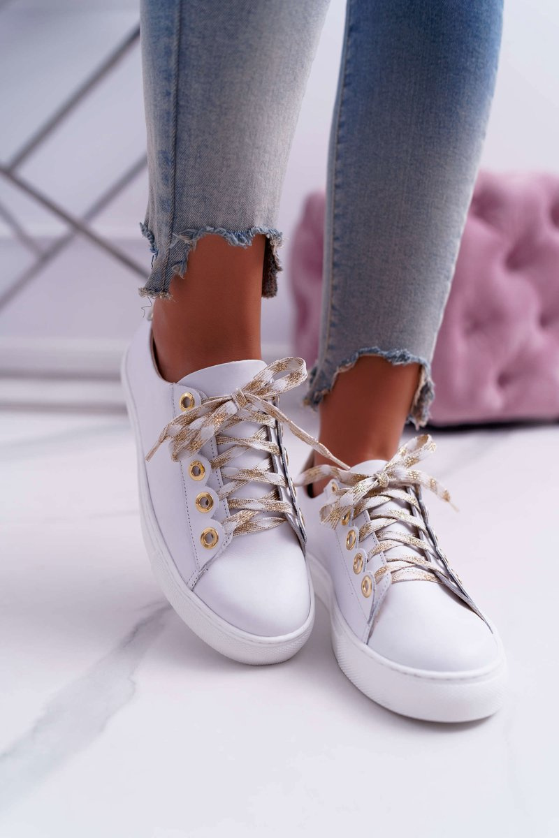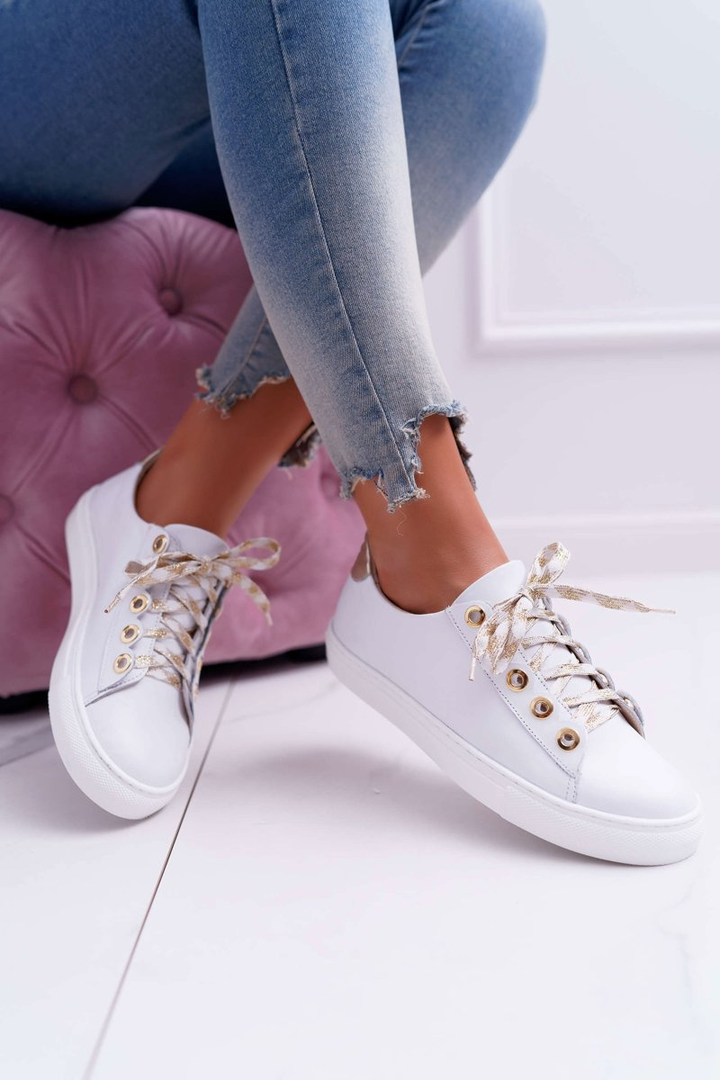 Чудові жіночі кросівки, які ідеально впишуться в будь-який стиль. Верх виготовлений з натуральної шкіри, прикрашений золотими люверсами. Устілка також натуральна шкіра, що забезпечить нам комфорт. Класичний дизайн в елегантній шкіряній версії. Під час вибору розміру запропонуйте таблицю розмірів, доступну після наведення вказівника на розмір або натискання на нього.