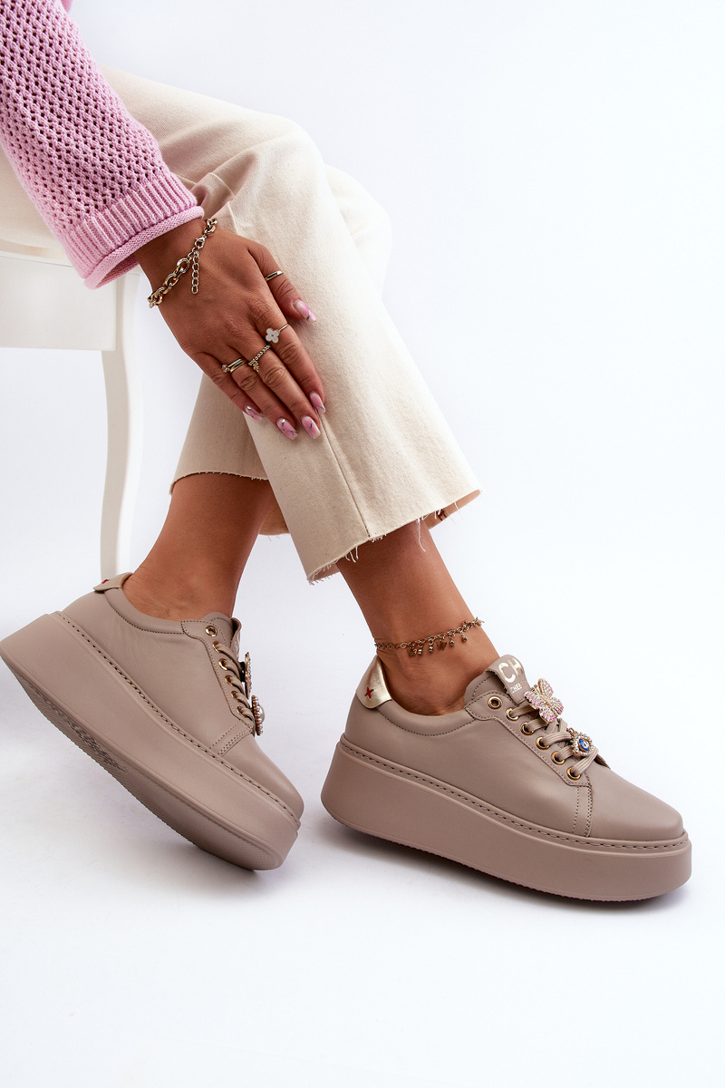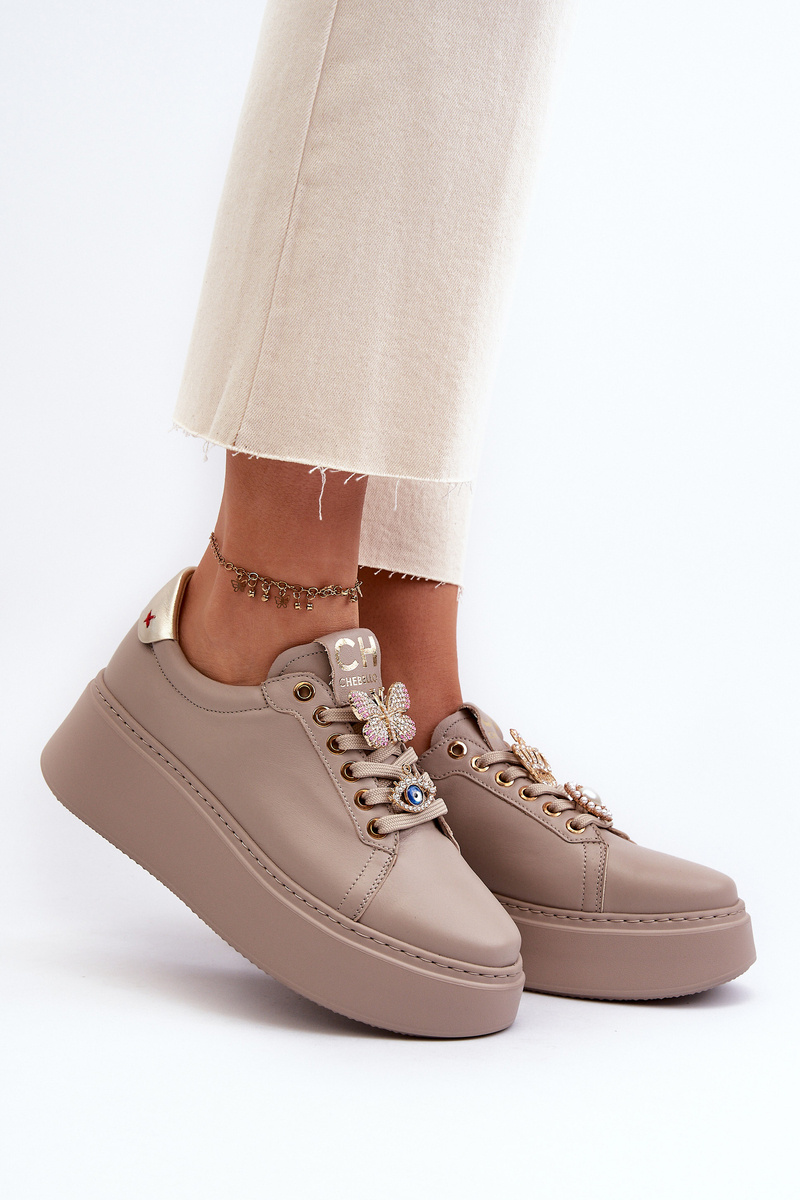Жіночі кросівки від бренду CheBello. Виготовлений з високоякісної гладкої шкіри. Встановлюється на платформу. Особливою перевагою цієї моделі є красиві декоративні брошки на шнурівці. Ця модель - чудова пропозиція для тих, хто хоче поєднувати комфорт з елегантністю у своїх повсякденних стилях! Обираючи розмір, орієнтуйтеся на таблицю розмірів.