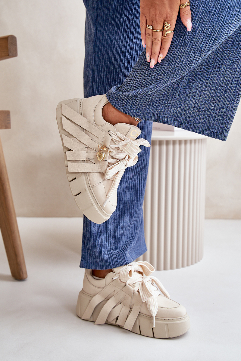 Жіночі кросівки з високоякісної натуральної шкіри - пропозиція для любителів елегантності в поєднанні з сучасним дизайном. Ці черевики на масивній платформі додають будь-якому вбранню не тільки висоти, але й виразності. Модель виділяється унікальною товстою шнурівкою, яка додатково прикрашена двома чарівними сердечками, що додає всьому тонкий романтичний відтінок. Ідеально підходять як для повсякденного, так і для сміливого вуличного одягу, ці кросівки поєднують комфорт носіння з винятковим стилем. Обираючи розмір, орієнтуйтеся на таблицю розмірів.