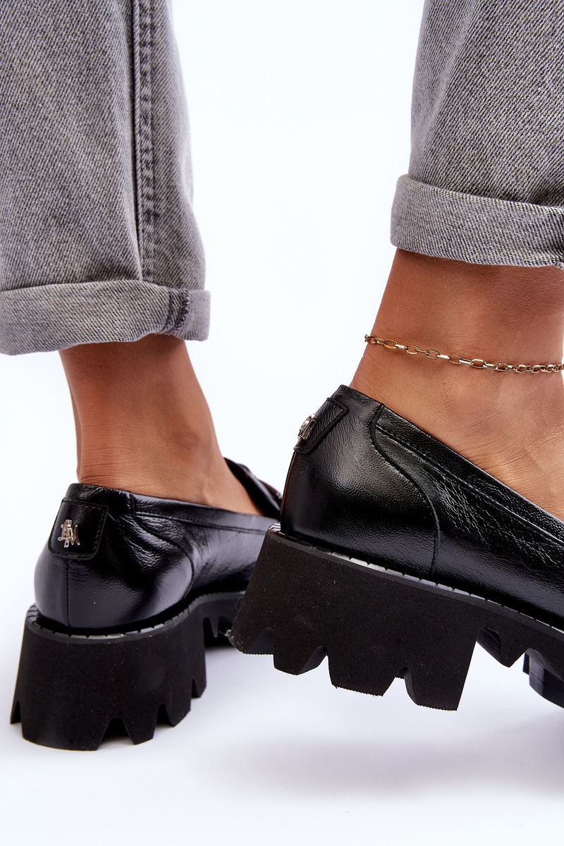 Елегантні жіночі лофери на масивній платформі та плоскому стійкому каблуці. Виготовлений з натуральної шкіри. Класична модель сліпони. Посилений носок, закруглений ніс. На передній частині є прикраса з пластику. М'яка шкіряна устілка забезпечить комфортне використання взуття. Ці туфлі чудово виглядатимуть у багатьох образах! Обов’язково перегляньте нашу повну колекцію лоферів! Вибираючи розмір, зверніться до таблиці розмірів.