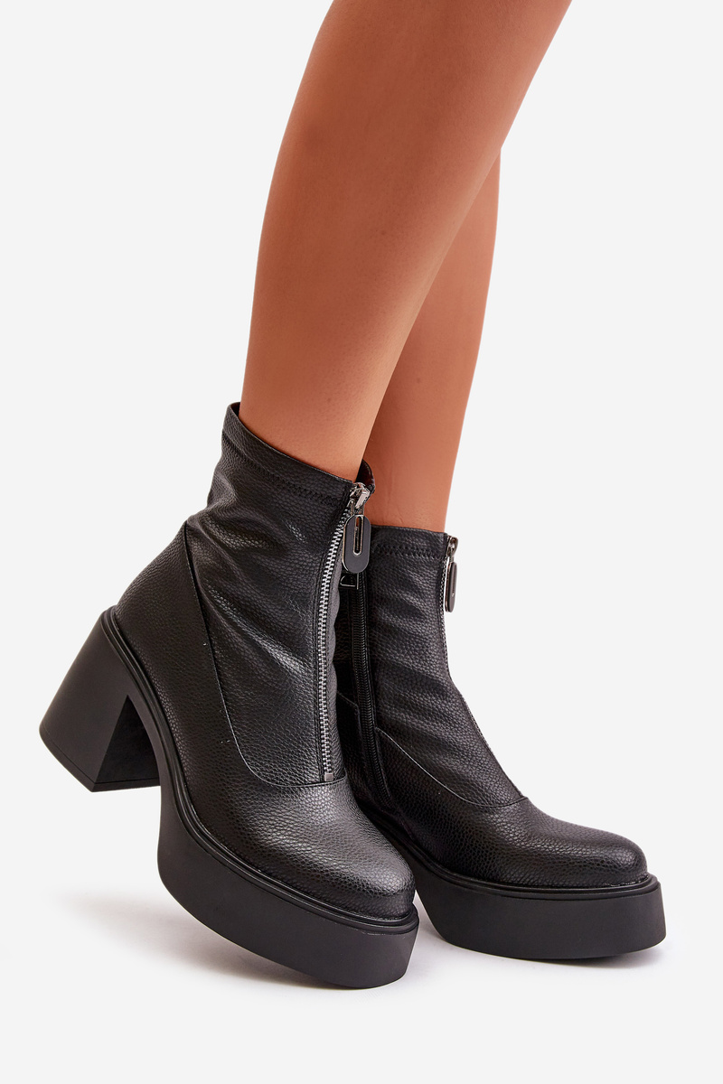 Черевики жіночі на каблуці у вигляді шпильки і платформі. Дана модель виконана з еко шкіри. Застібається збоку на блискавку. Вони також мають жорсткий носок і декоративну блискавку спереду. Мова була прикрашена стразами. Зсередини чоботи були утеплені підкладкою. При виборі розміру орієнтуйтеся на розмірну таблицю.