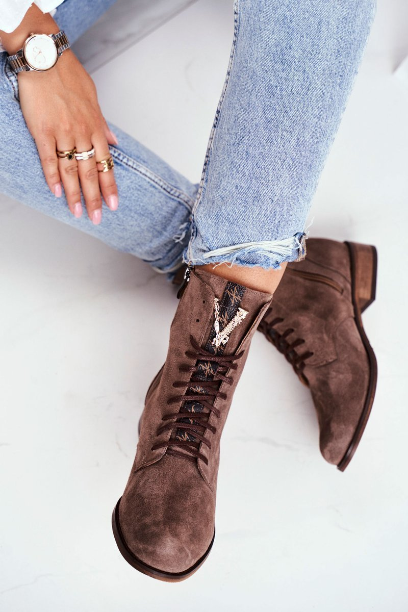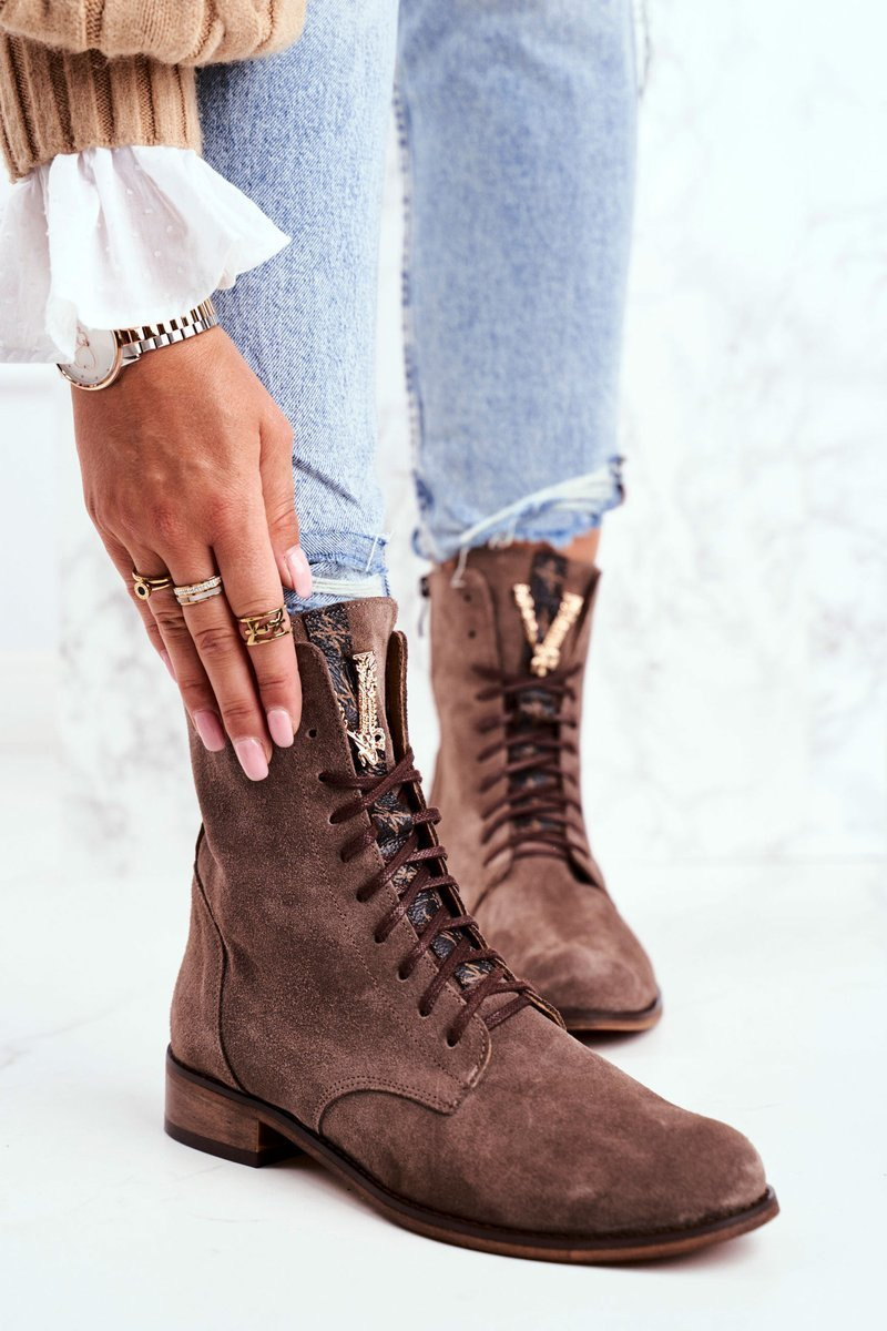 Черевики - це не тільки взуття для холодних днів. Вони також чудово підходять для створення весняних стилізацій. Взуття виготовлене з натуральної шкіри нубук. Орнамент у вигляді золотої літери V виглядає красиво і підкреслює їх стиль. Застібку-блискавку, вшиту збоку, буде легше надіти, а шнурки забезпечать кращу посадку. Черевики на тонкому плоскому каблуці. При виборі розміру скористайтеся таблицею розмірів.