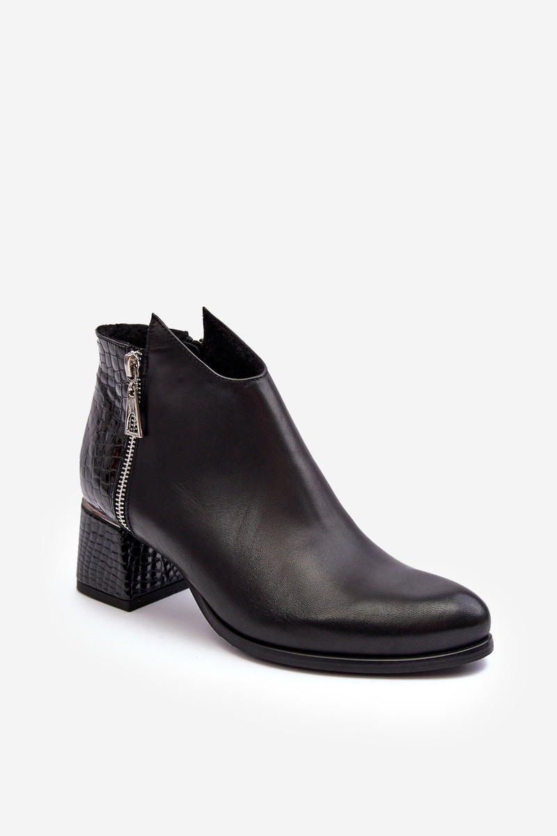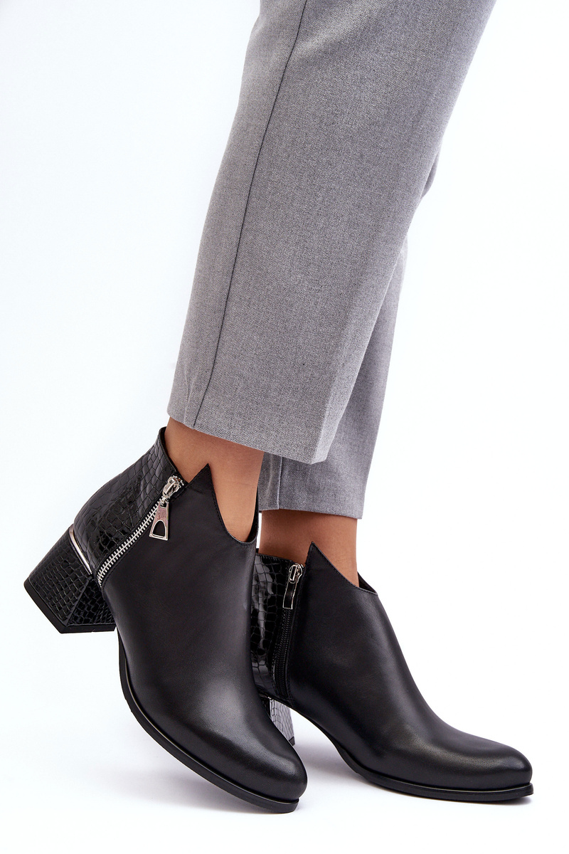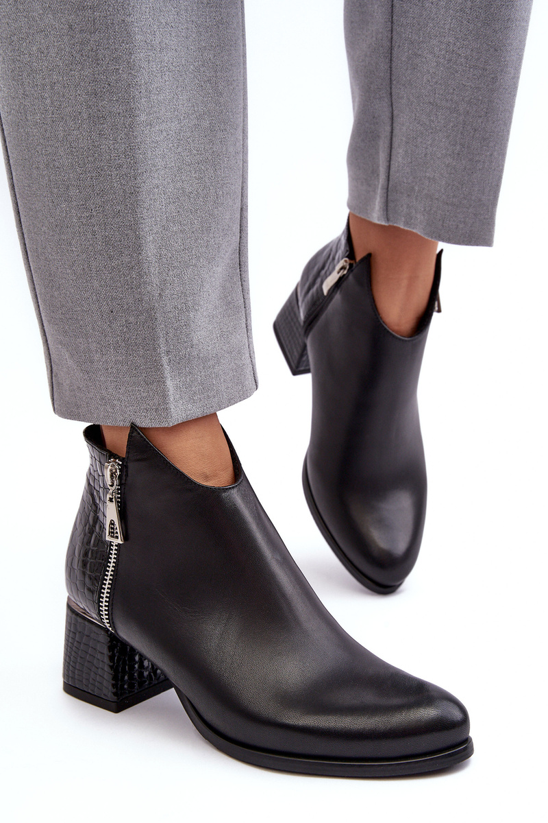 Чудові жіночі ботильйони на високому каблуці у вигляді невисокого каблука мають халяву до щиколотки. Вони виготовлені з високоякісної натуральної шкіри. Дана модель застібається на блискавку. Зовні також є декоративна блискавка. Черевики мають жорсткий носок. Це взуття утеплене взуттєвою ковдрою. Ця модель чудово підійде для багатьох укладок! При виборі розміру орієнтуйтеся на таблицю розмірів.