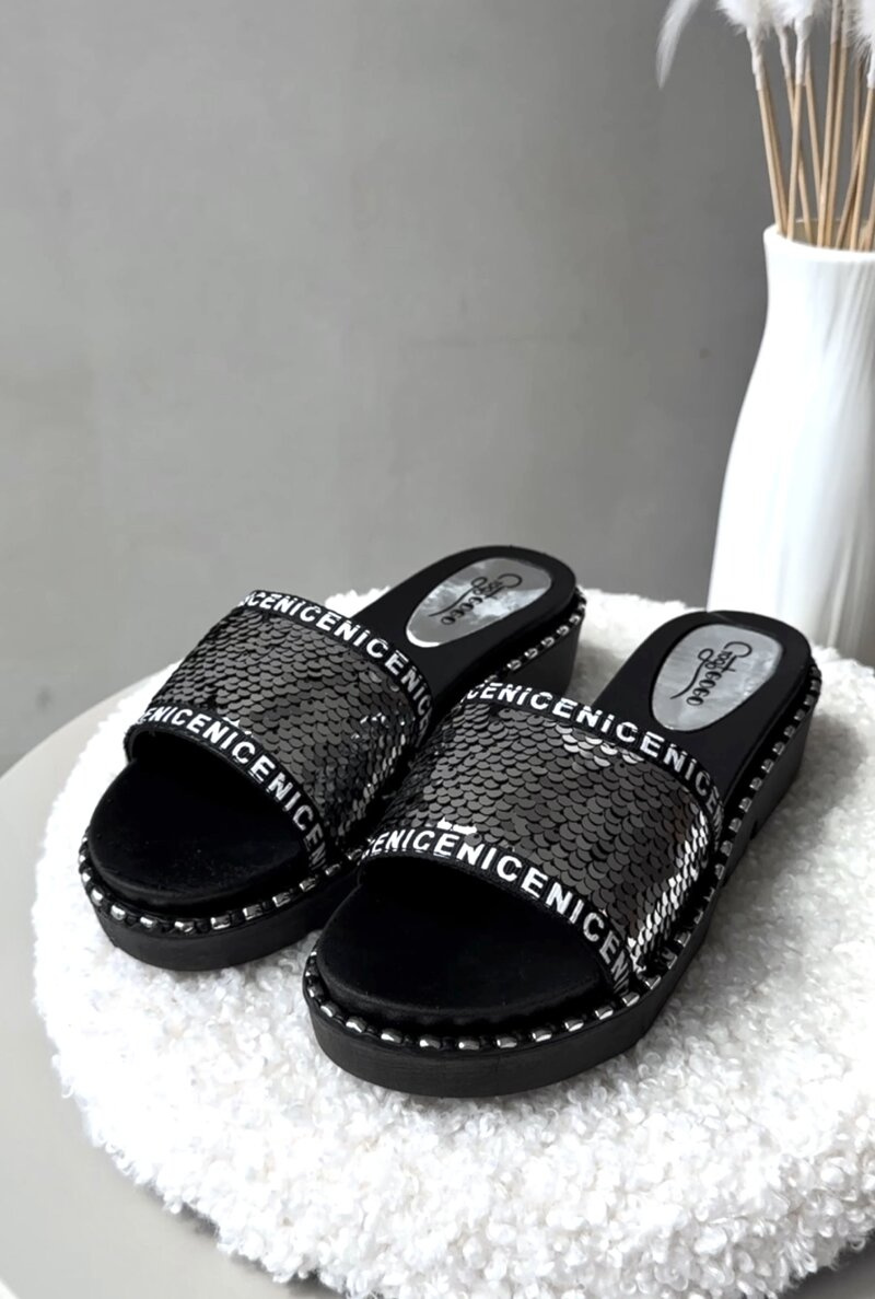 Жіночі шльопанці з паєтками чорно-сріблясті Rivanique