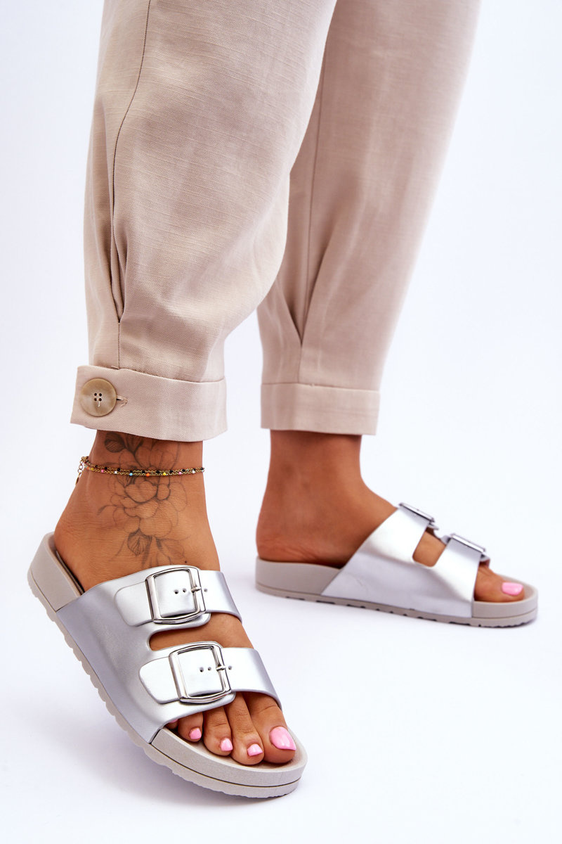 Ці жіночі босоніжки виготовлені з екошкіри. Ця модель має два широких ремені з пряжкою, яку можна регулювати. Босоніжки ідеально підходять для літніх прогулянок і повсякденних походів по магазинах. Устілка з екошкіри забезпечує комфорт і амортизацію. Підошва виготовлена із синтетичного матеріалу.