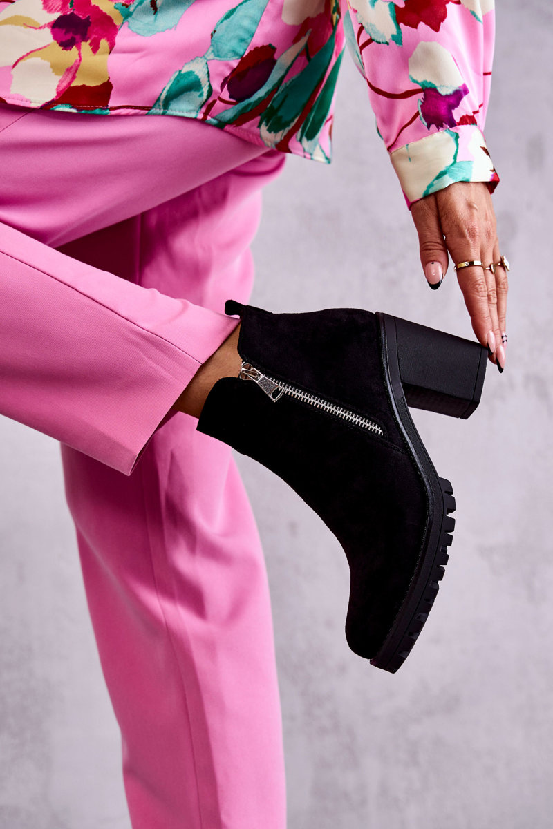 Класичні жіночі чоботи з двома блискавками з боків верху. Одна з них роз'ємна, інша лише декоративна. Чоботи кріпляться на каблук у вигляді низької стійки. Підошва з протектором забезпечує стійкість на нерівній поверхні. Туфлі виготовлені з еко замші з верхом по щиколотці. Вони мають жорсткий каблук. Чудова модель для осінніх днів! При виборі розміру скористайтеся таблицею розмірів.