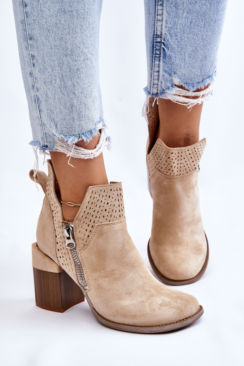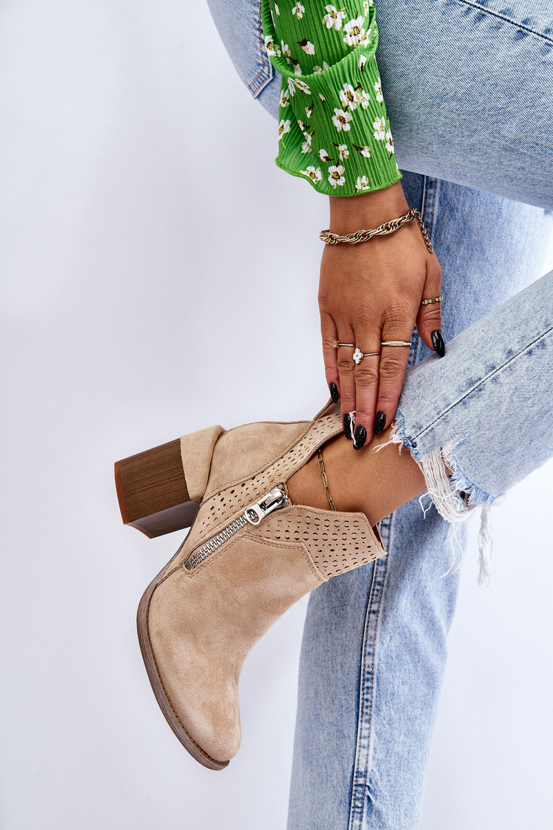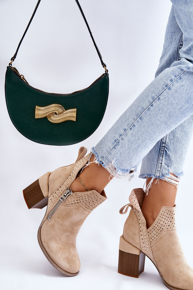 Модні черевики на масивному каблуці у вигляді колодки виготовлені з еко замші з вирізами з боків верху. Крім того, їх прикрашали ажурним візерунком. Дана модель має додаткову блискавку збоку верху. Каблук у цих черевиках посилений. М'яка і зручна устілка виконана з еко шкіри. Ви повинні мати цю модель у своєму гардеробі! Обираючи розмір, орієнтуйтеся на таблицю розмірів.