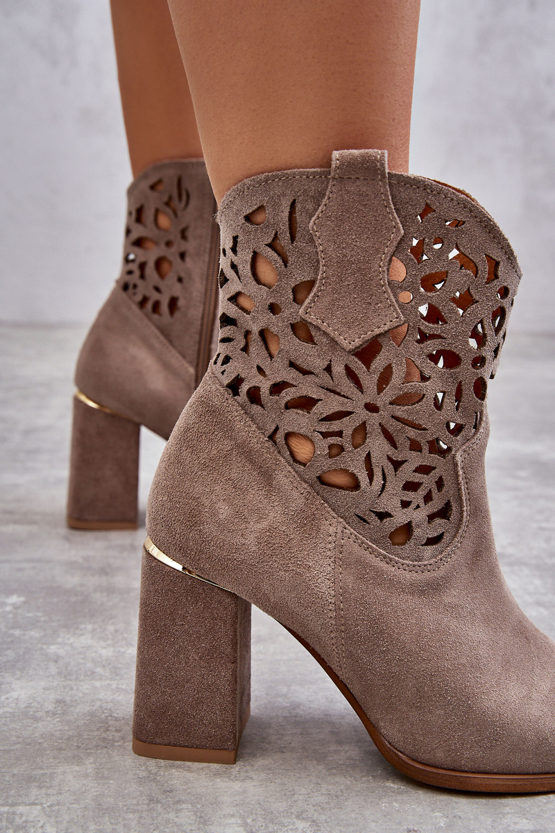 Модні, ажурні чоботи на підборах у вигляді стовпчика виготовлені з високоякісної натуральної шкіри. Чоботи мають частковий декор у вигляді ажурного візерунка. Застібається на блискавку. М'яка, надзвичайно зручна устілка виготовлена з натуральної шкіри. Чудова модель для багатьох стилів! Обираючи розмір, орієнтуйтеся на таблицю розмірів.