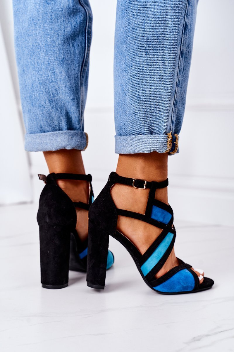 Замшеві босоніжки на блочному каблуці чорно-сині Emolly