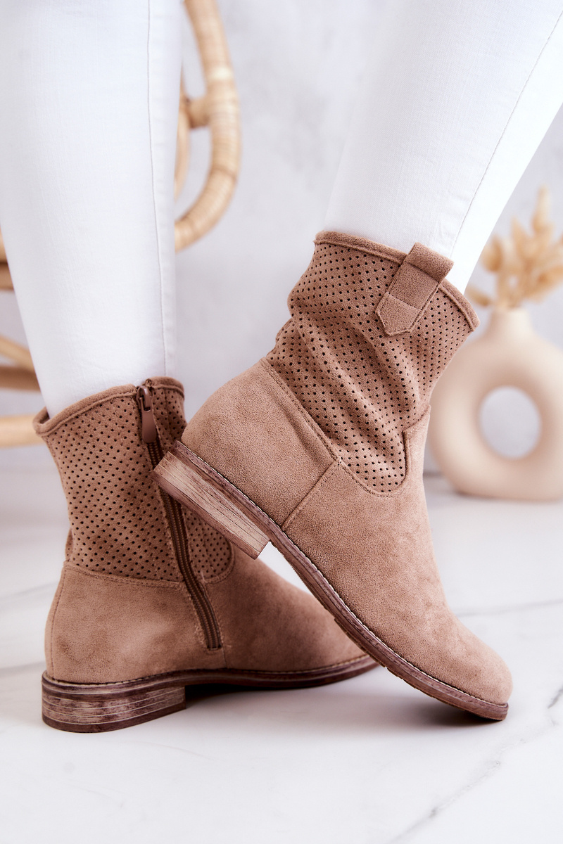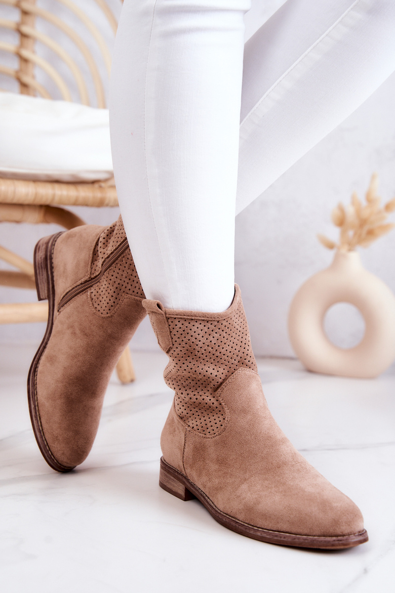 Черевики з приємної на дотик еко замші. Зверху мають ажурні прикраси. Застібається на блискавку. Плоский каблук гарантує комфорт під час використання. Мають м'яку устілку з екошкіри та нековзку підошву. Обов'язково перегляньте інші моделі чобіт! При виборі розміру скористайтеся таблицею розмірів.