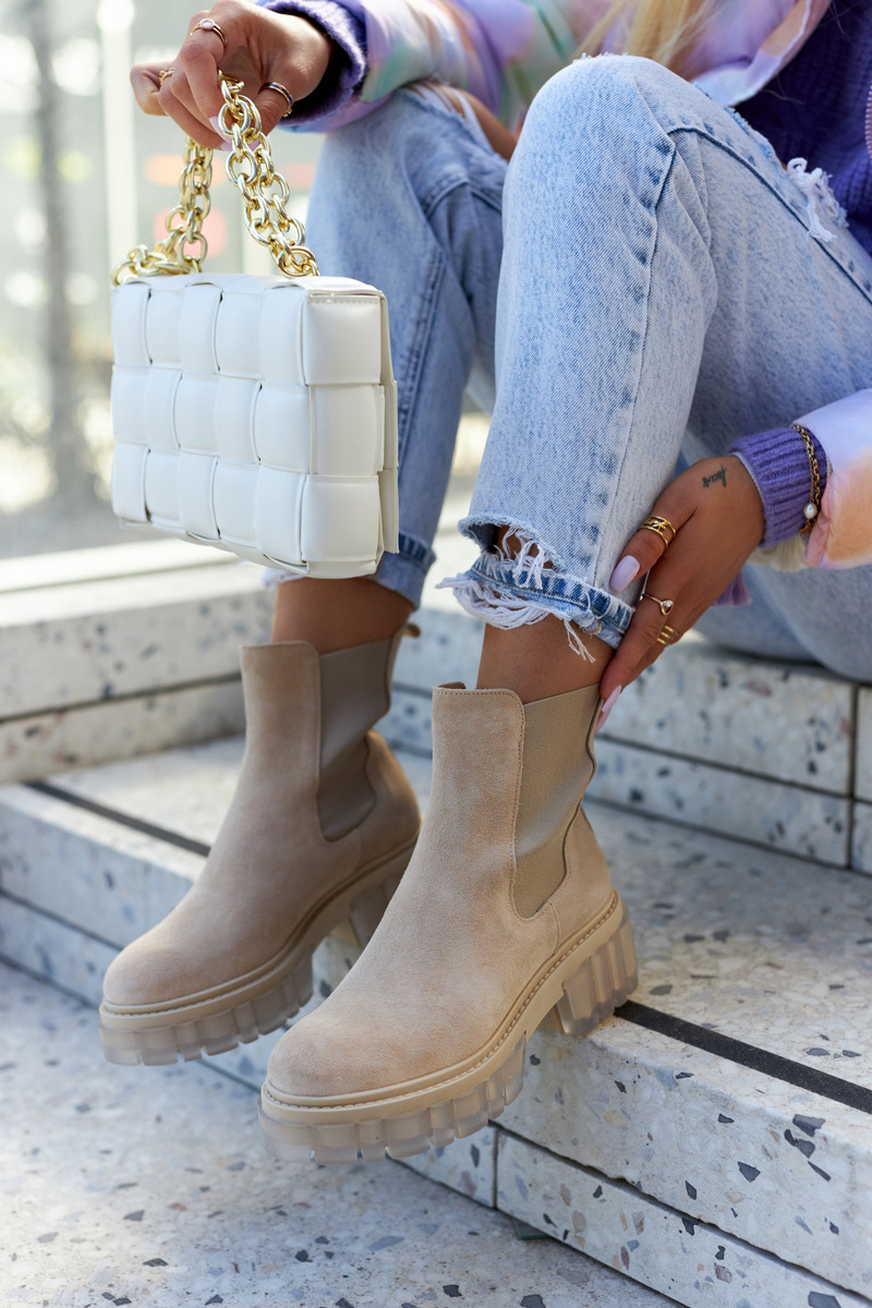 Черевики на масивній платформі з широким каблуком в стилі чобіт челсі. Вони мають високий верх, що досягає вище щиколотки. Виготовлений з натуральної замші. Мають додаткову гнучку вставку, завдяки якій верх буде ідеально відповідати ширині ноги. Боковини підошви оздоблені прозорим, гумовим матеріалом. Вибираючи розмір, скористайтеся таблицею розмірів