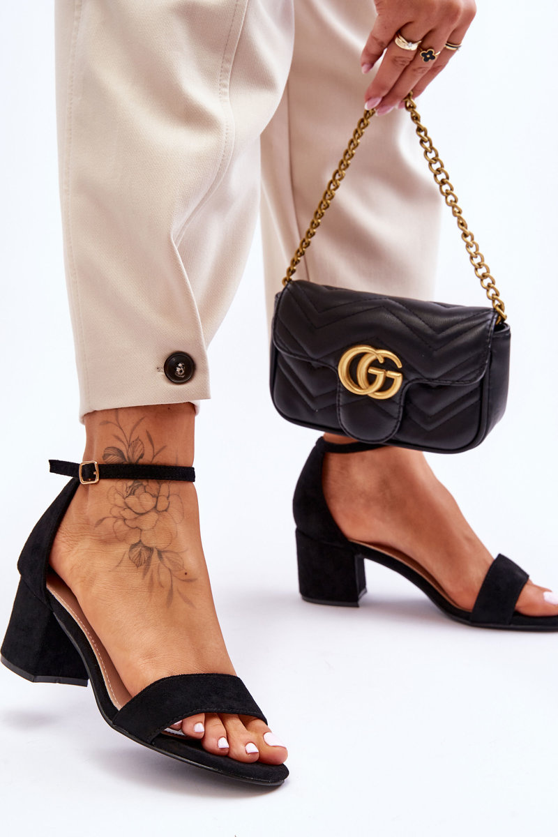 Класичні босоніжки на невисокому каблуці у вигляді стійкої стійки виготовлені з приємної на дотик еко замші. Ці босоніжки мають посилений каблук. Устілка виконана з екошкіри, що забезпечить комфорт при носінні взуття. Ніс відкритий, закруглений. Застібається навколо щиколотки за допомогою регульованого ремінця з пряжкою. Ви точно будете використовувати їх у багатьох ситуаціях! Обираючи розмір, орієнтуйтеся на таблицю розмірів.