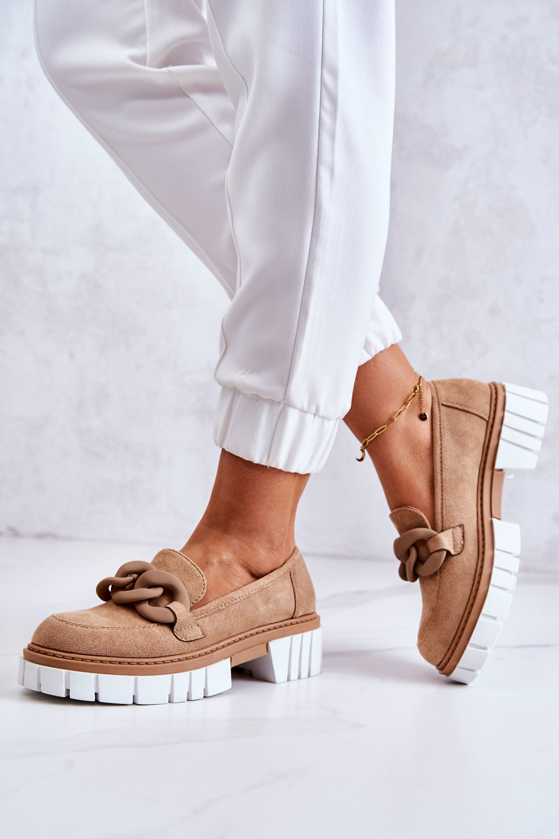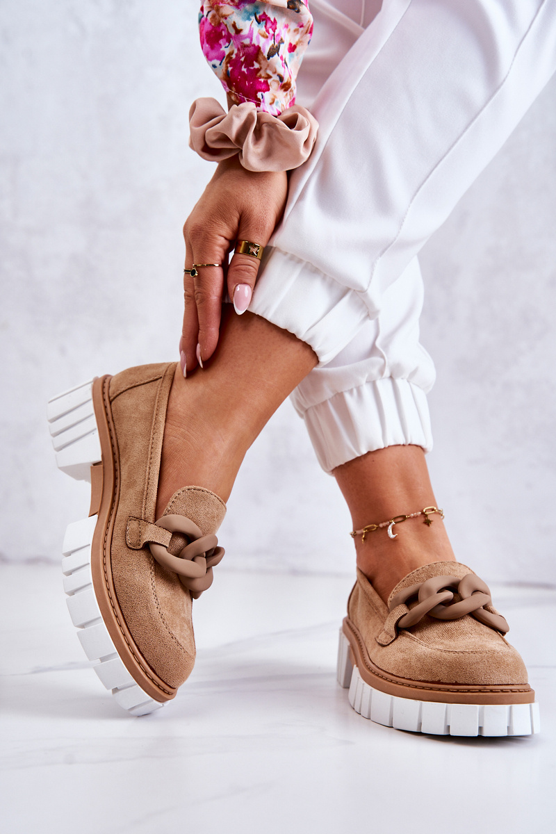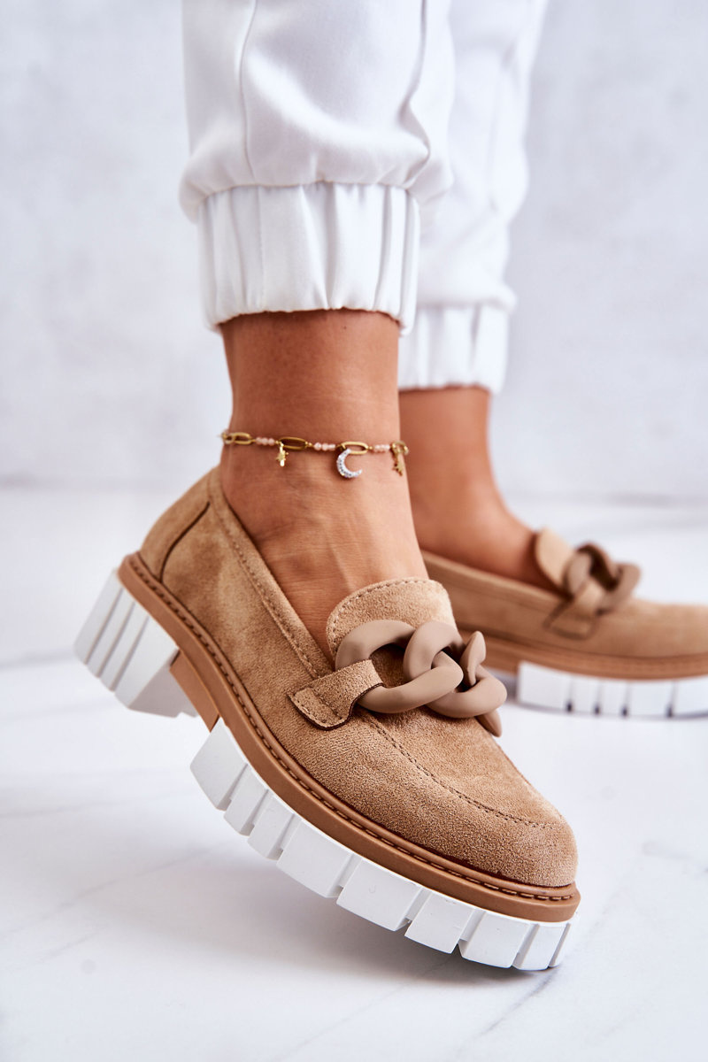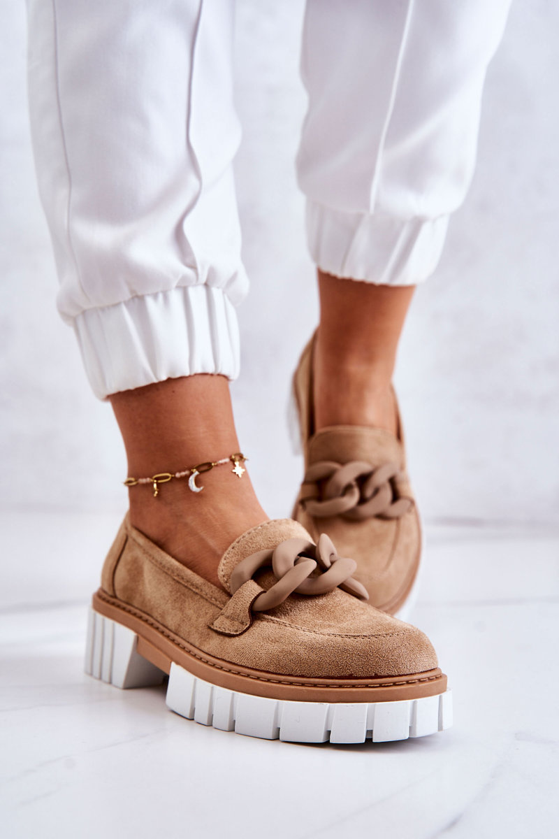 Класичне взуття в стилі красивих лоферів. Взуття виготовлене з якісної еко замші. Декоративна ланцюжок спереду виготовлена з пластику. Взуття має жорсткий каблук. Модель сліпони. Вони кріпляться на масивній платформі і плоскому каблуці з канавками з боків. М'яка устілка з еко шкіри забезпечить комфорт під час використання. Ця модель - ХІТ майбутнього сезону! Ви обов'язково повинні їх мати! При виборі розміру скористайтеся таблицею розмірів.