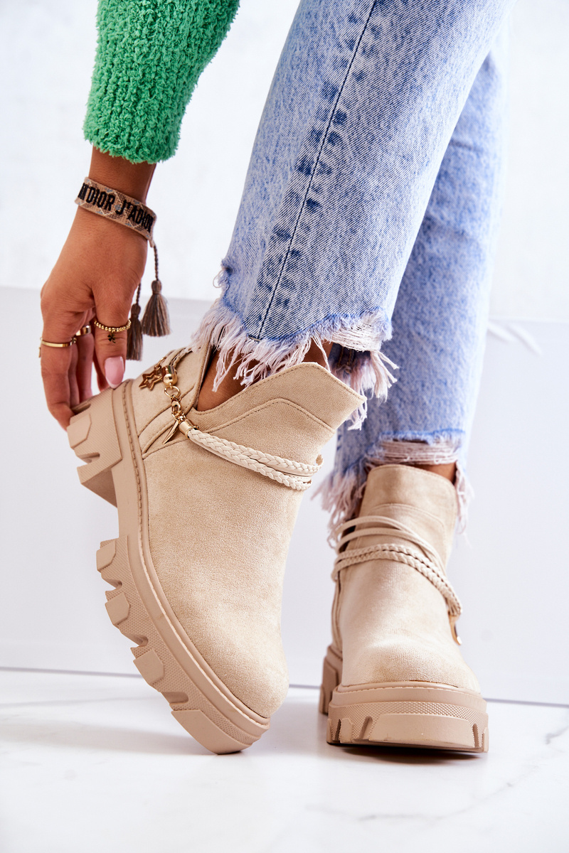 Черевики з вирізами з еко замші. Мають масивну підошву, яка захищає від холодної землі. Плетені декоративні планки мають додаткову підвіску у вигляді зірки з фіанітами. Їх можна від'єднати. Завдяки вирізам на щиколотках ці ботильйони виглядають дуже ефектно. При виборі розміру скористайтеся таблицею розмірів.