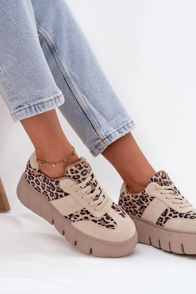 Замшеві утеплені жіночі кросівки на масивній платформі Vinceza 66841 Леопардовий бежевий