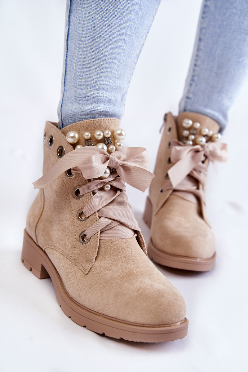 Замшеві утеплені чоботи на блискавці з перлами бежеві Raiso