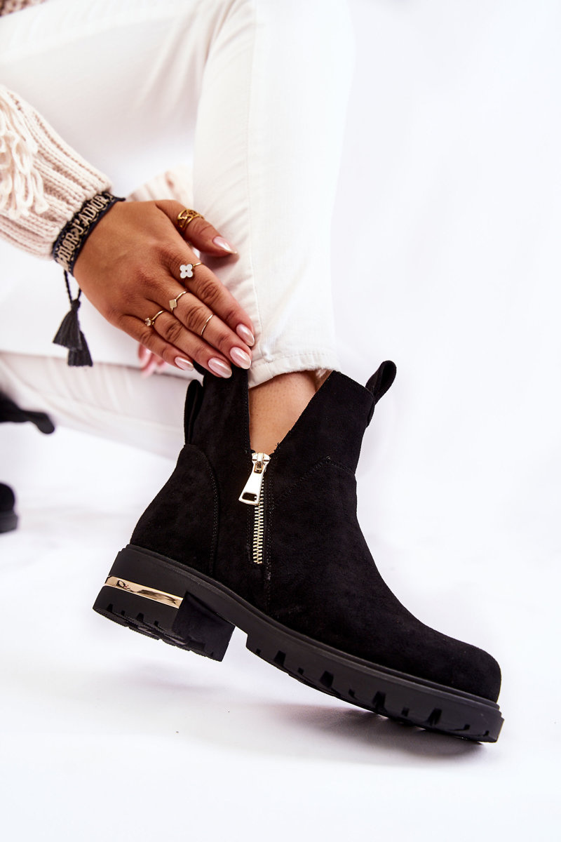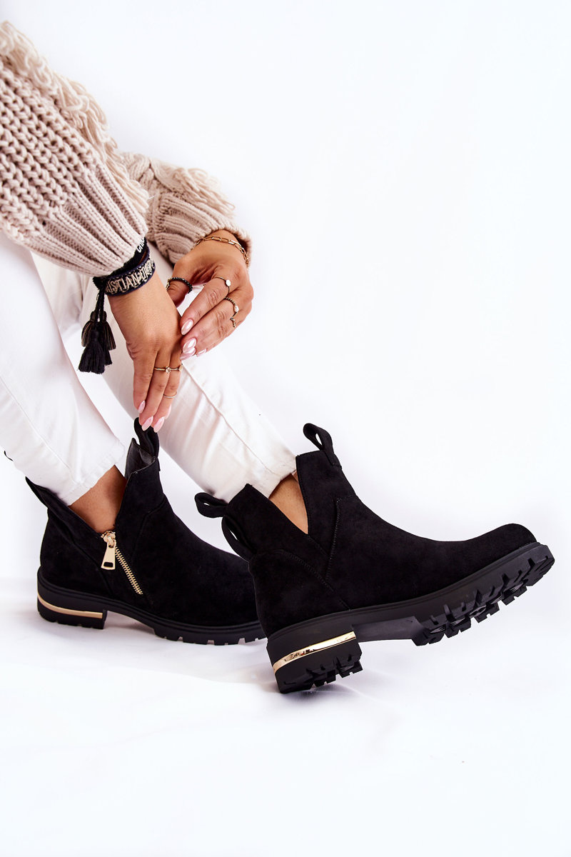 Чоботи в стилі челсі мають неправильну форму верху з вирізами з боків. Виготовлений з екологічної замші. Вони мають застібку-блискавку збоку верху та жорстку п'яту. На плоскій каблуці з дзеркальним декором і протектором. Ця модель ідеально впишеться в осінні тренди! При виборі розміру скористайтеся таблицею розмірів.