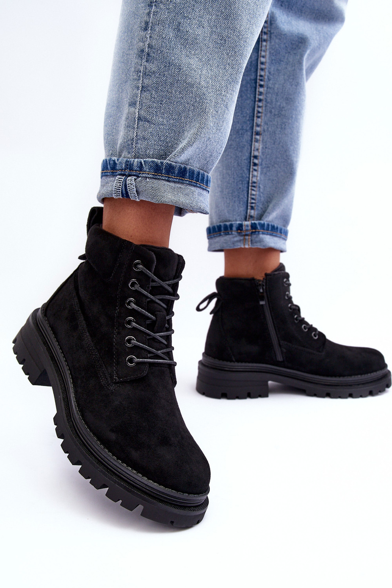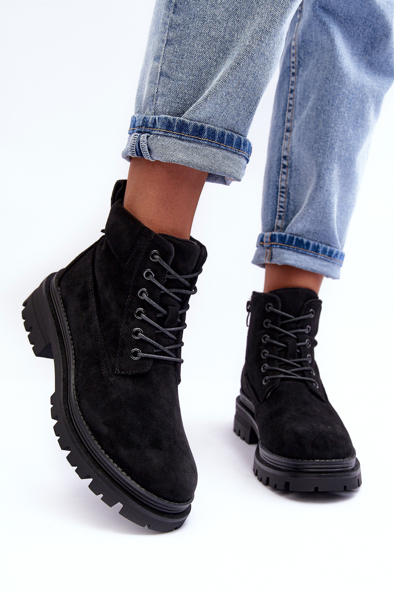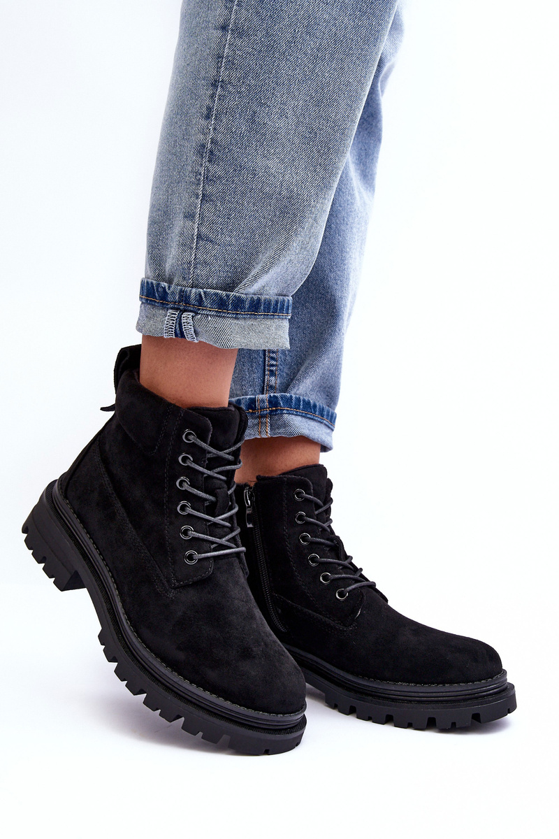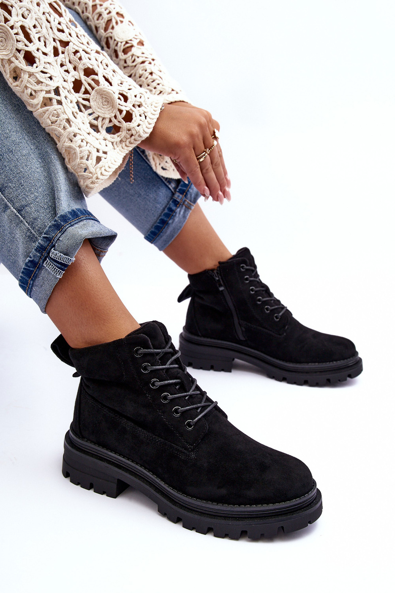 Черевики жіночі з еко замші. Встановлені на плоскій стійкий каблук і платформу. Всередині тепле і приємне на дотик хутро. Застібаються на блискавку і додатково мають шнурівку. Посилений носок. Взуття ідеальне для зимових днів! При виборі розміру орієнтуйтеся на таблицю розмірів.