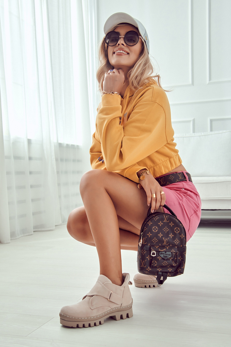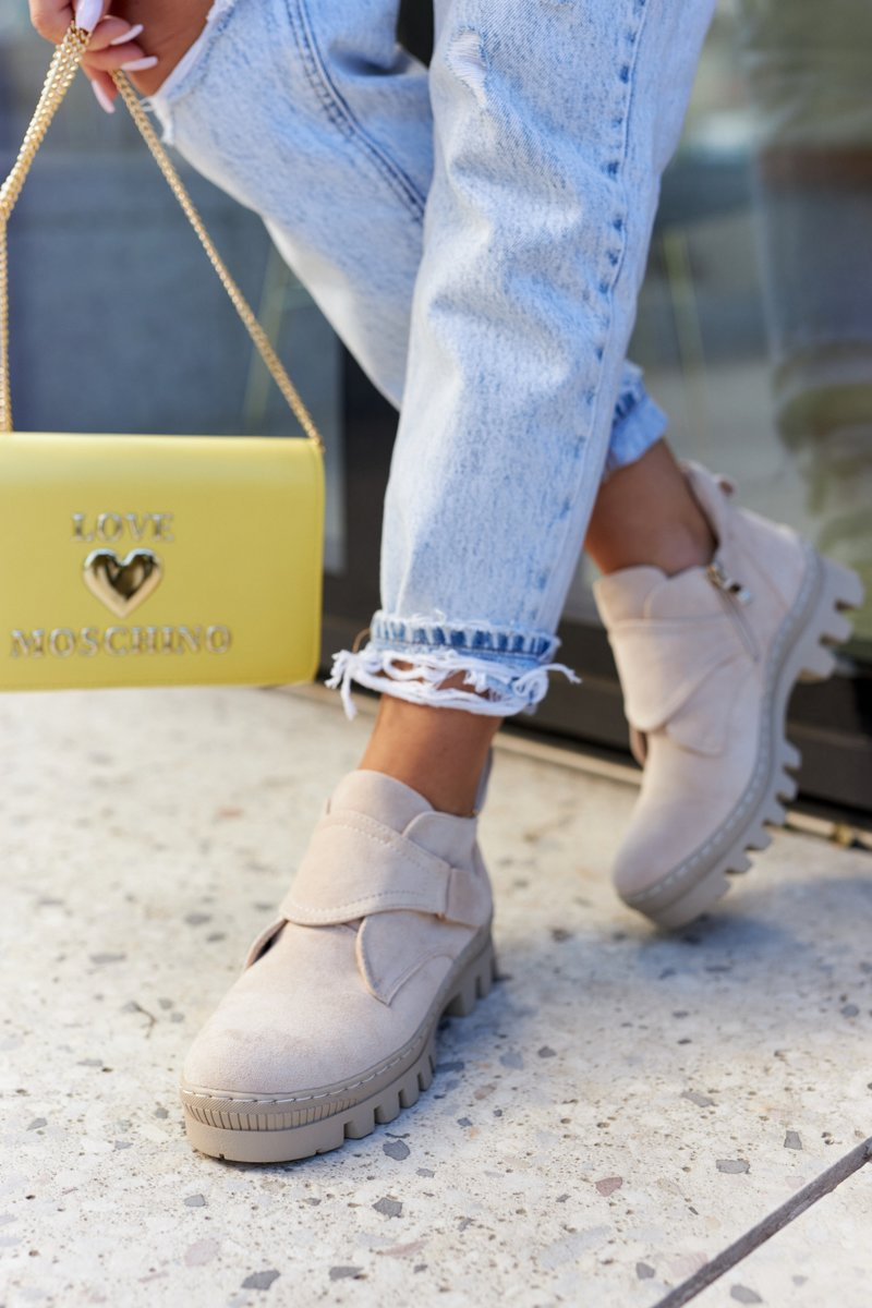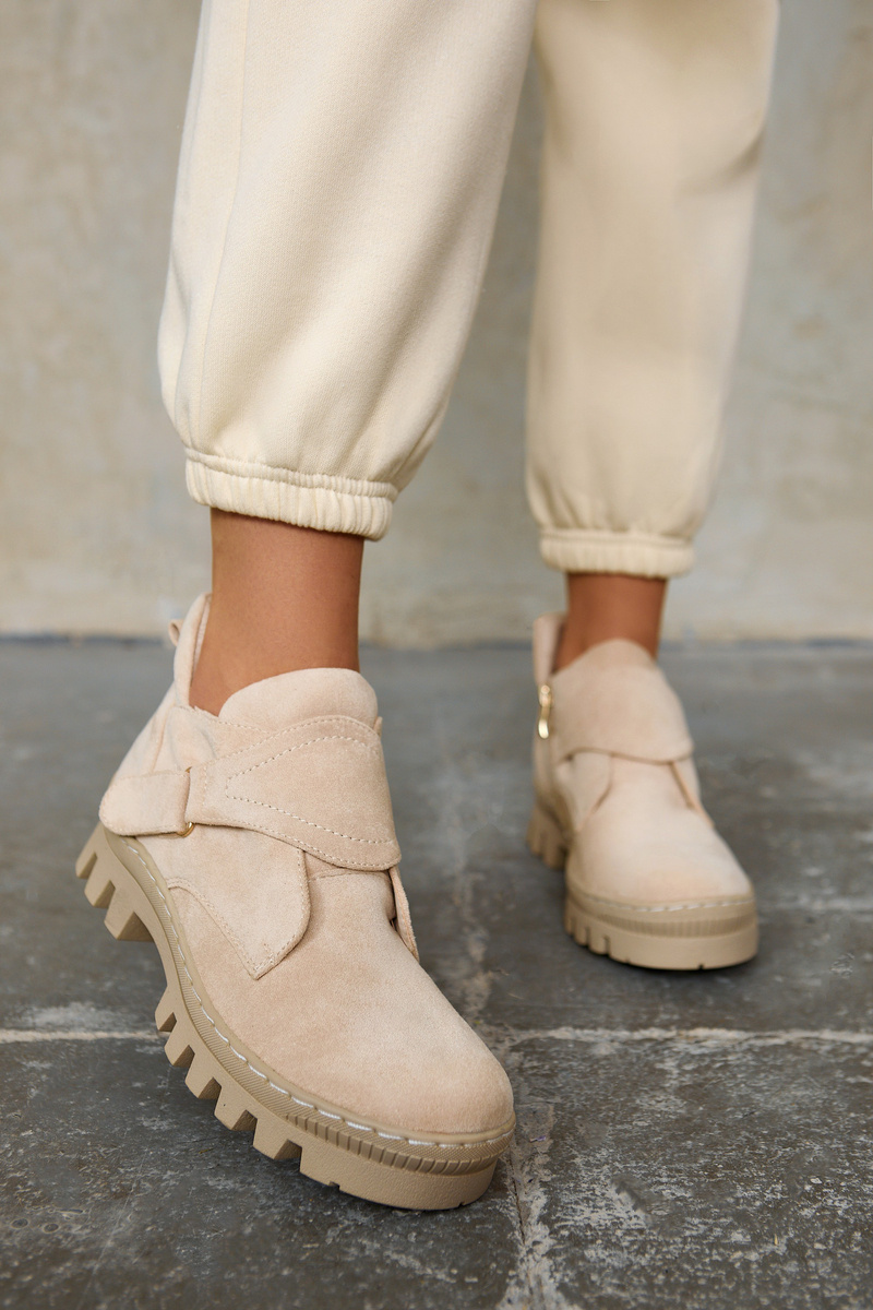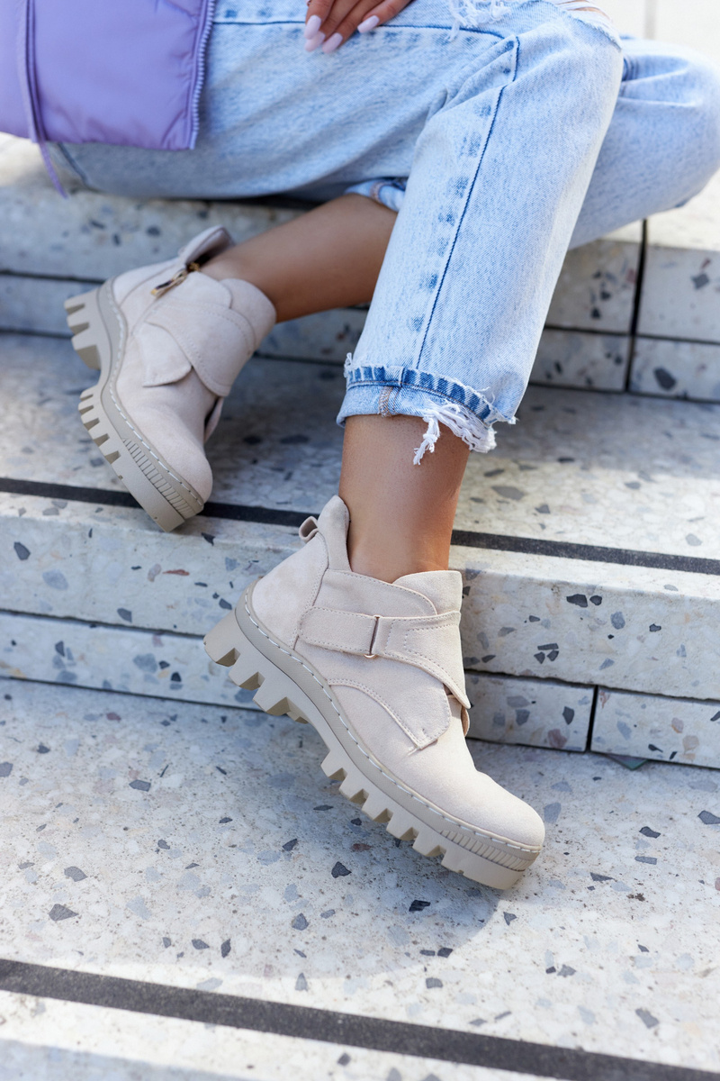Трапери на товстій підошві з високим протектором. Верх виготовлений з еко замші, збоку застібається на блискавку і додаткову липучку. Взуття має круглий носок. Ззаду на верху є ботівстрап, тобто петля, яка полегшує одягання та знімання взуття. Підборник посилений. Ці туристичні черевики сучасного крою ідеально підходять для весняних стилізацій! При виборі розміру скористайтеся таблицею розмірів.
