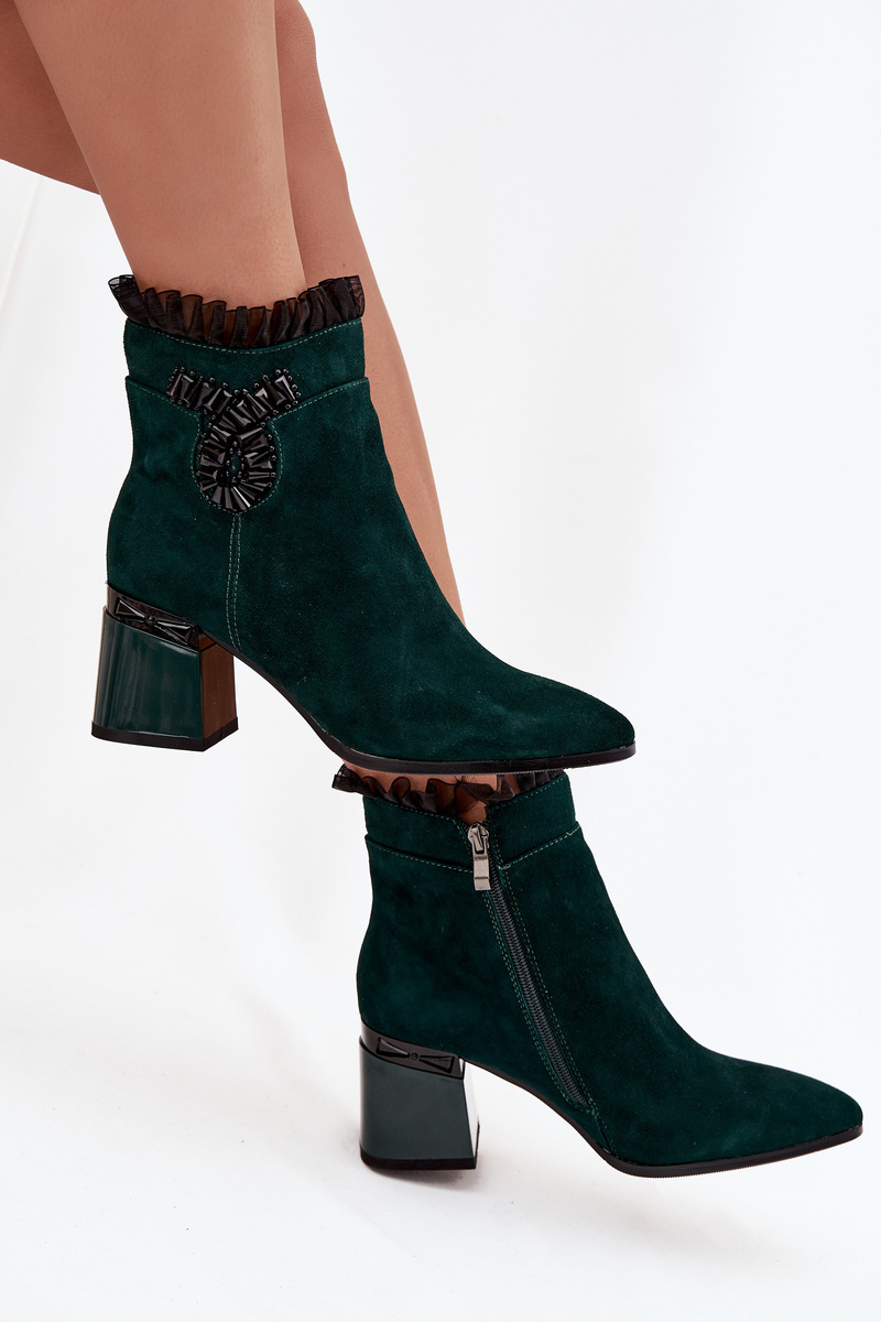 Замшеві шкіряні жіночі чоботи на каблуці з оздобленням з підкладкою D&A MR52-127 темно-зелений