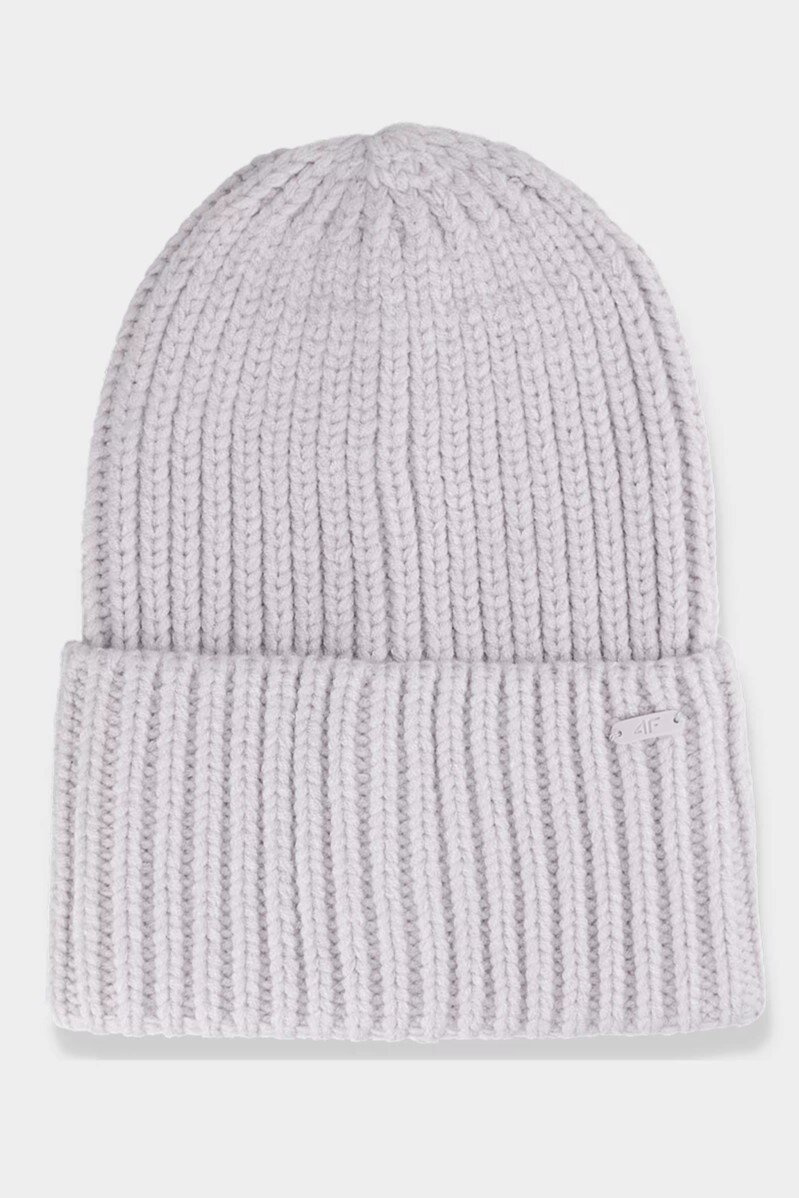 Жіноча шапка від бренду 4F виготовлена з додаванням перероблених матеріалів (містить не менше 30% переробленого поліестеру). Одношарова, з відкидною манжетою.