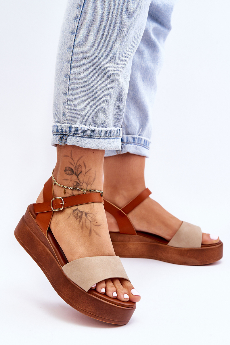 Зручні шкіряні босоніжки на танкетці бежево-коричневого кольору Tifena