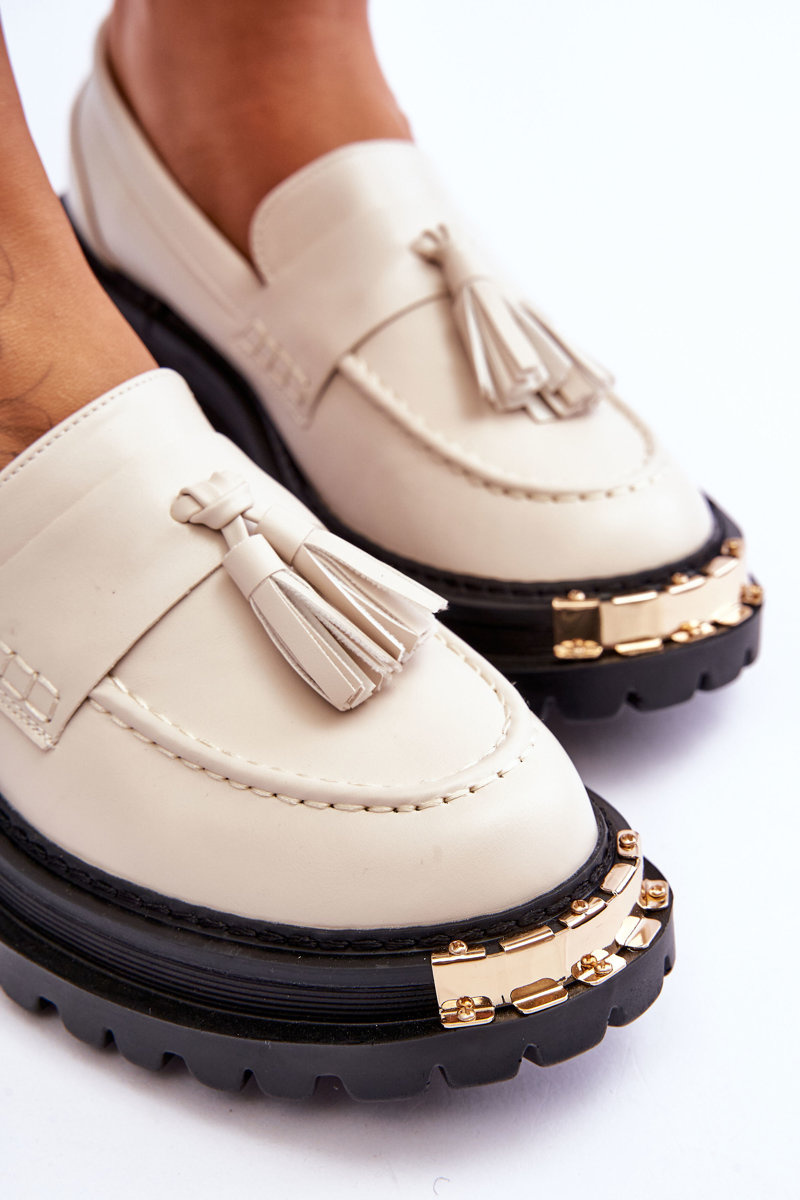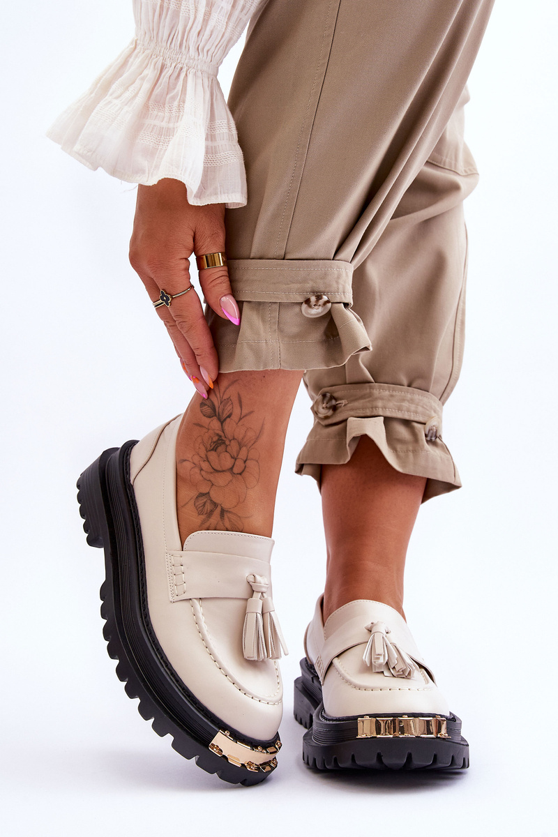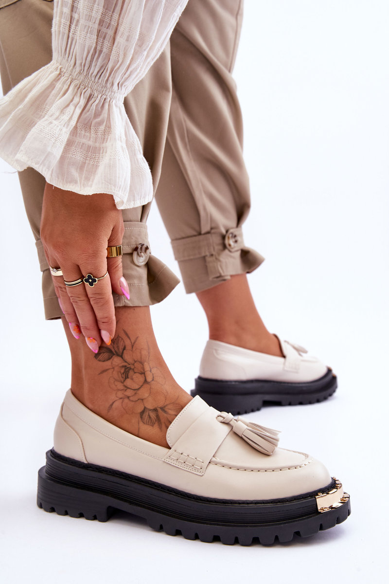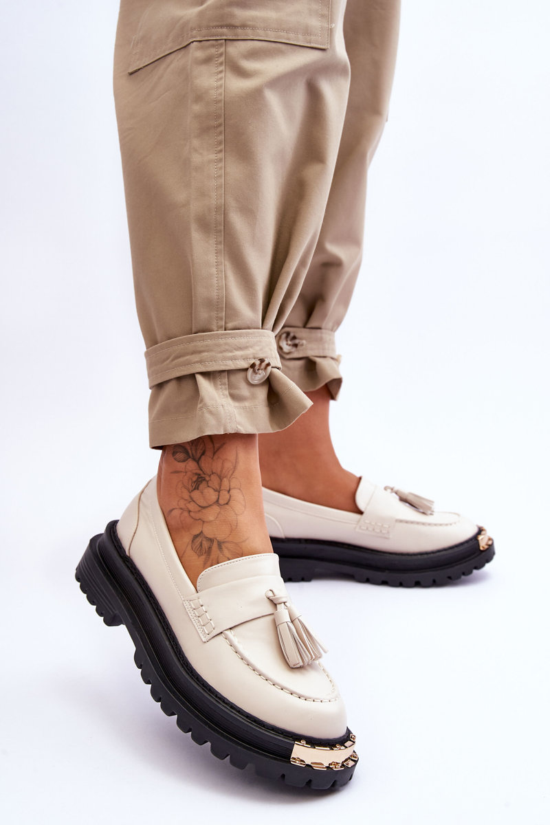 Класичне взуття - мокасини виготовлені з екологічної шкіри. Спереду на платформі вони мають декоративні елементи, а посередині взуття – бахрома. Лофери ставилися на плоскій каблуці і платформі. Ця модель має злегка посилений каблук. Надзвичайно стабільний крій, який повинен бути вашим! Обираючи розмір, орієнтуйтеся на таблицю розмірів.