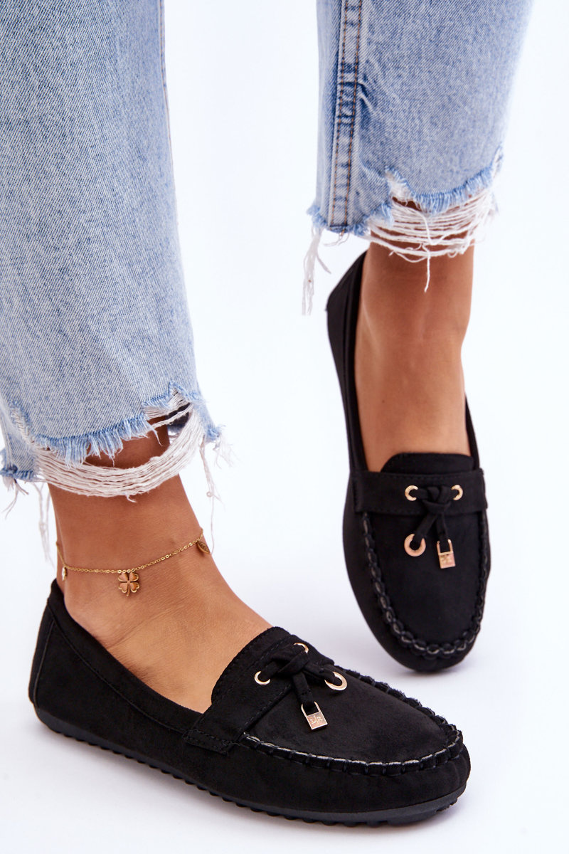 Класичні жіночі лофери виготовлені з еко замші. Спереду дана модель має декоративні нашивки з замком і кільцем. Мокасини були розміщені на ніжній платформі. М'яка устілка забезпечить комфорт під час використання взуття. Ця модель має злегка закруглений ніс. Ідеально підходить для багатьох стилізацій у весняно-осінньому сезоні! Обираючи розмір, орієнтуйтеся на таблицю розмірів.