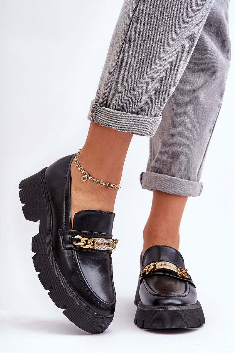 Ці модні жіночі лофери чудово пасуватимуть до багатьох нарядів! Вони сидять на масивній платформі і плоскому каблуці. Лофери мають злегка посилений носок і устілку з екошкіри. На передній планці ланцюжок з декоративною пластиною зі стразами. Ви повинні мати цю модель! При виборі розміру орієнтуйтеся на таблицю розмірів.