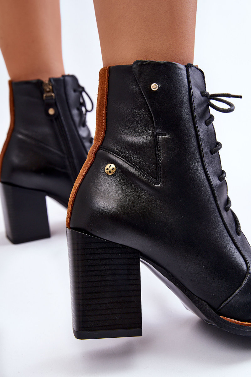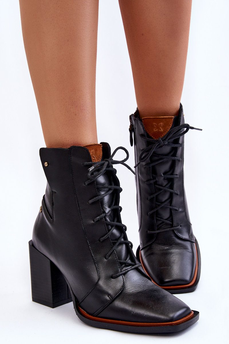 Жіночі черевики Maciejka виготовлені з високоякісної натуральної шкіри. Модель класично зашнурована і закривається на блискавку. Черевики мають модний квадратний носок. Каблук посилений. М'яка устілка забезпечить комфорт протягом усього дня. Чоботи встановлювалися на каблук у вигляді високої колодки. Обираючи розмір, орієнтуйтеся на таблицю розмірів.
