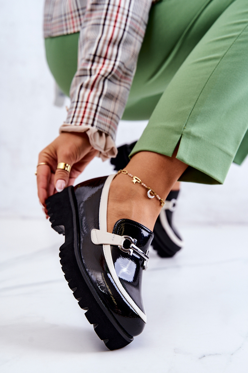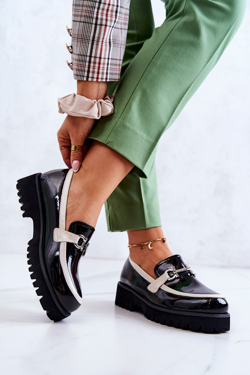 Мрієте про нове взуття? Ця модель розроблена з урахуванням майбутніх модних тенденцій! Лаковані туфлі в стилі лоуфер. Вони мають округлий носок і металевий орнамент. Устілка з натуральної шкіри дуже зручна у використанні. Масивна підошва з плоским каблуком виготовлена ​​з пластику. Ця чудова модель чекає саме на вас! При виборі розміру скористайтеся таблицею розмірів.