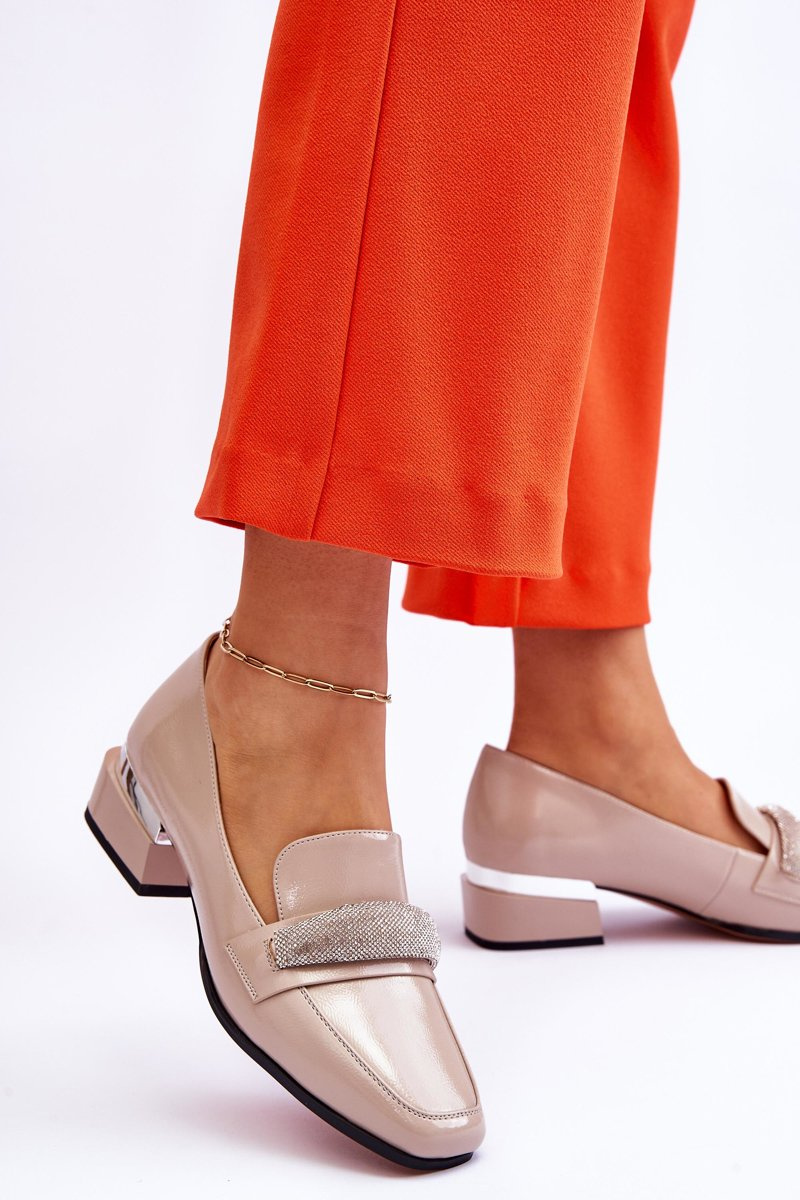 Лаковані лофери на високих підборах із кубічним цирконієм бежевого кольору