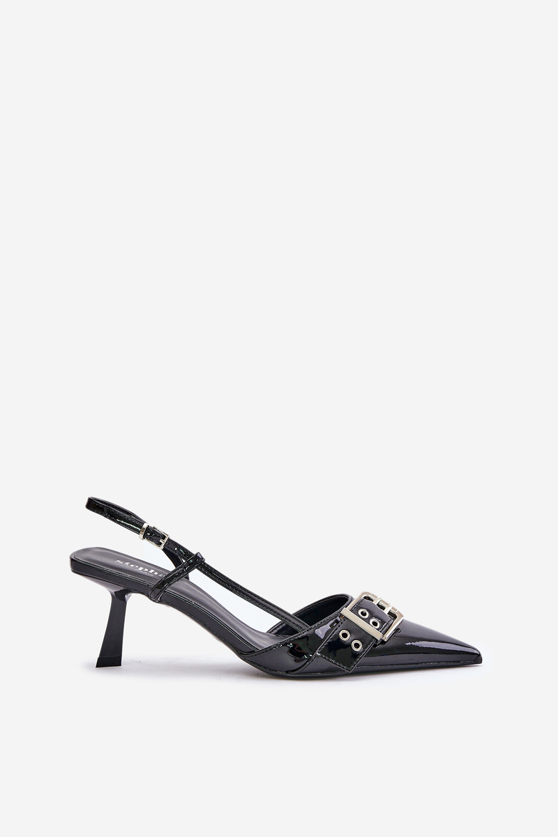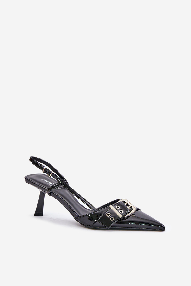 Жіночі лаковані туфлі на шпильці з екошкіри - елегантний вибір для урочистих випадків. Модель має загострені носки та регульований ремінь із пряжкою, що забезпечує ідеальну посадку. Додатковим декоративним елементом є стильна пряжка спереду, яка додає виразності. Ідеально підходить для елегантних суконь і офіційних стилів. Обираючи розмір, зверніться до таблиці розмірів.