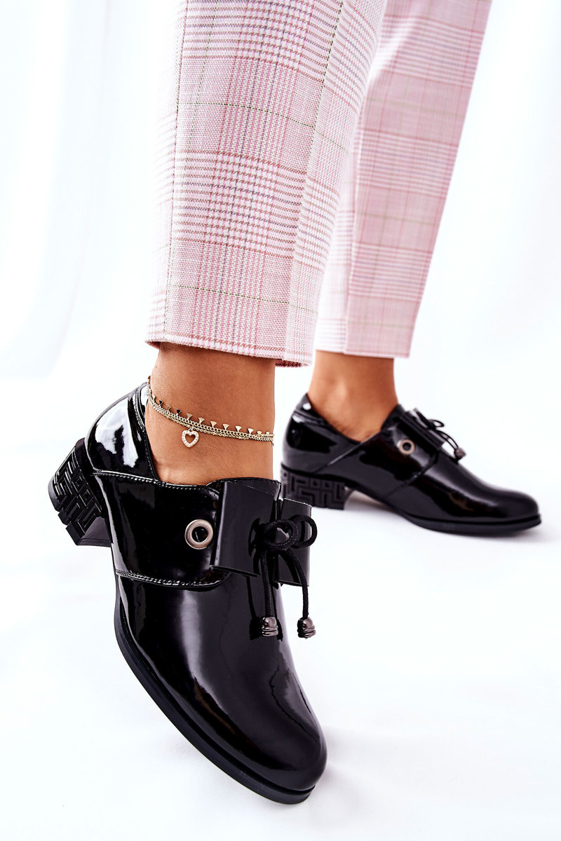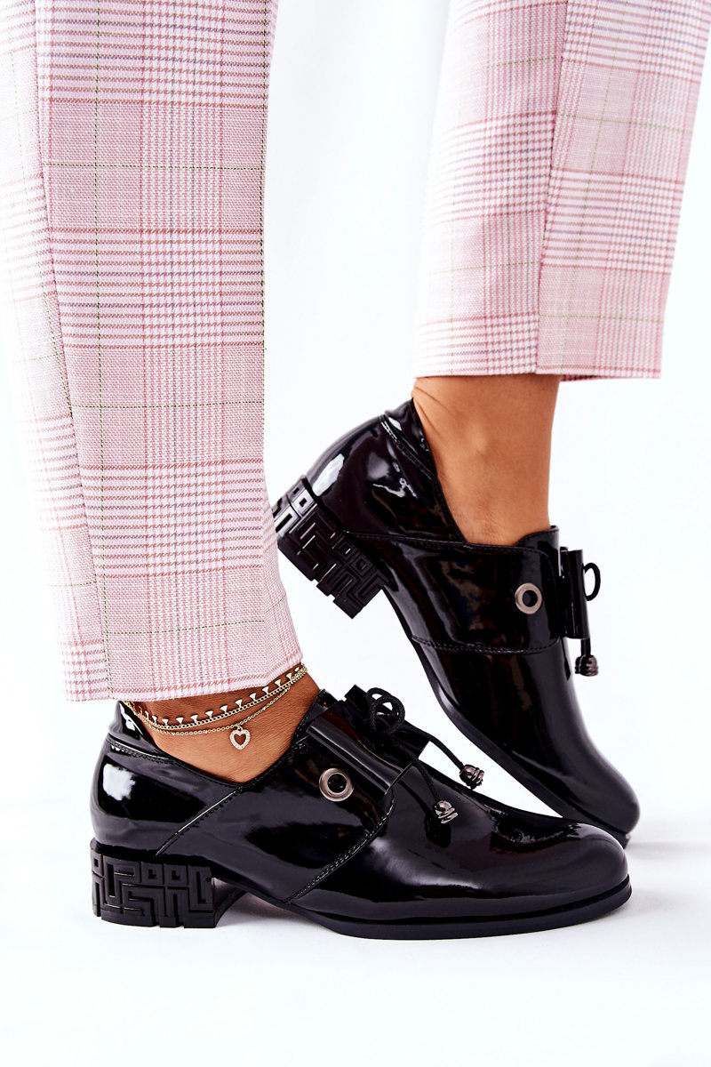Елегантні напівчеревики від Sergio Leone. Взуття виготовлене з особливою ретельністю з лакованої екологічної шкіри. Взуття має м'яку устілку з натуральної шкіри. Декорований каблук і бантик зверху. При виборі розміру скористайтеся таблицею розмірів.