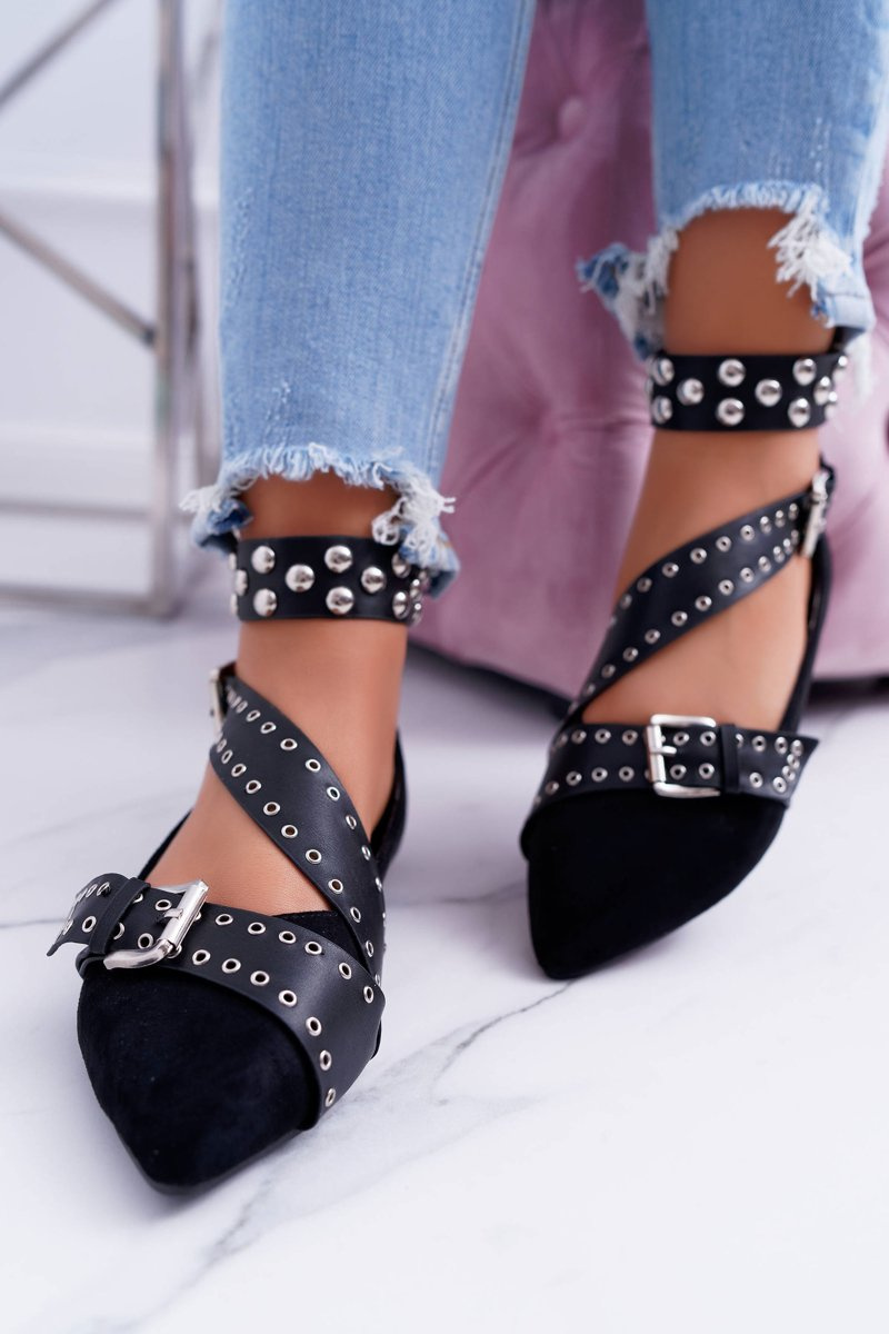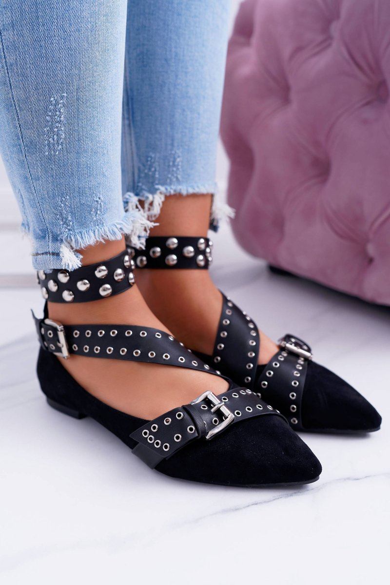 Лу Бу | Чорні балетки на ремінцях із заклепками та гострими загостреннями Esteria