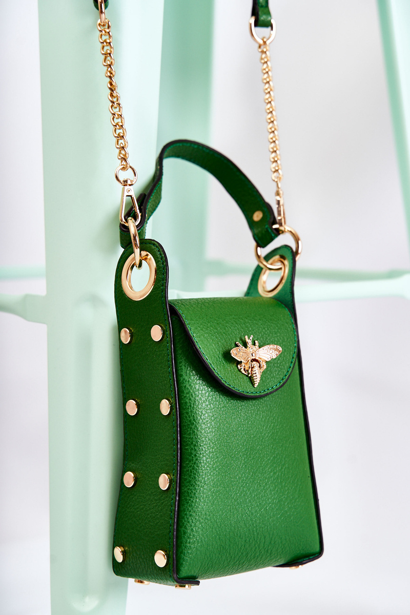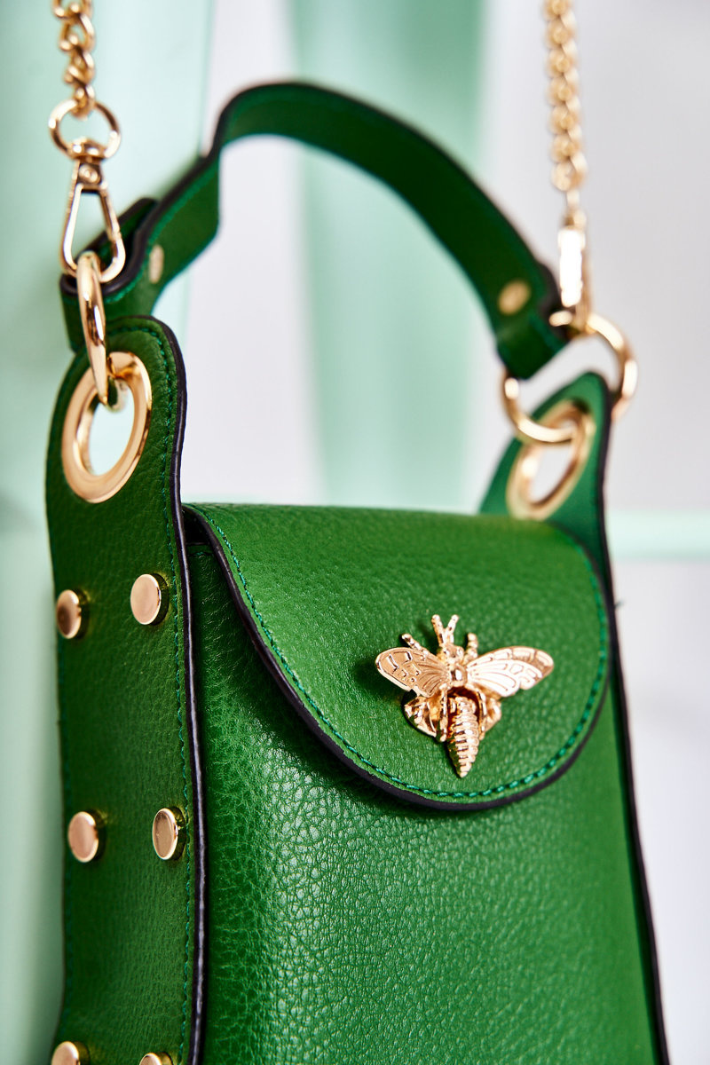 Маленька жіноча сумочка з еко шкіри. Має нерозбірну ручку, яка не регулюється. Відділення закривається клапаном із засувкою. На передній частині розташована декоративна емблема у вигляді комахи. З боків сумки розміщені декоративні шпильки. Додатково до сумки додається регульований знімний ремінь з ланцюжком. Ця сумка – хіт сезону, тому не зволікайте і купуйте її вже сьогодні! Перегляньте також інші моделі сумок, які є в нашій пропозиції!