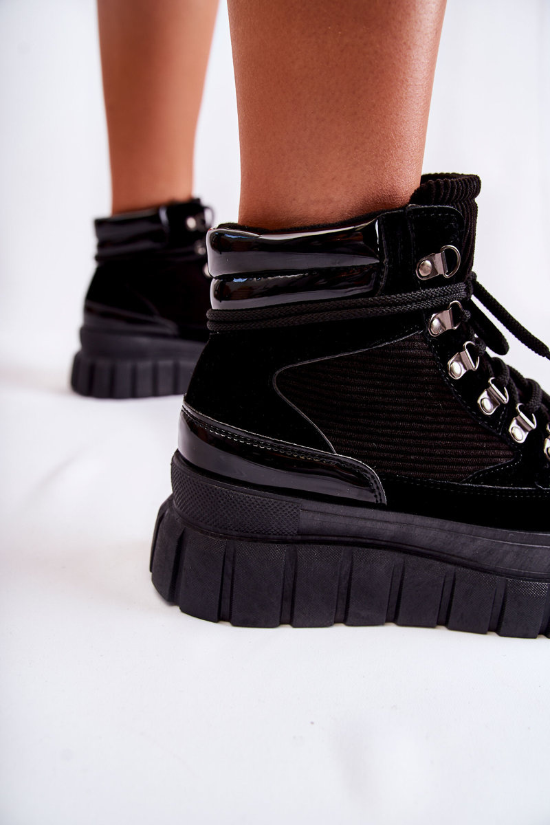 Модні жіночі чоботи виготовлені з текстильного верху. Мають вставки з еко шкіри. Модель зав'язується круглими шнурками. Зсередини утеплена взуттєвою ковдрою. Черевики встановлені на платформу з пазами. Нековзна підошва. Округлий ніс. Ви повинні мати цю модель у своєму гардеробі! Не чекайте більше - купуйте сьогодні! При виборі розміру скористайтеся таблицею розмірів.