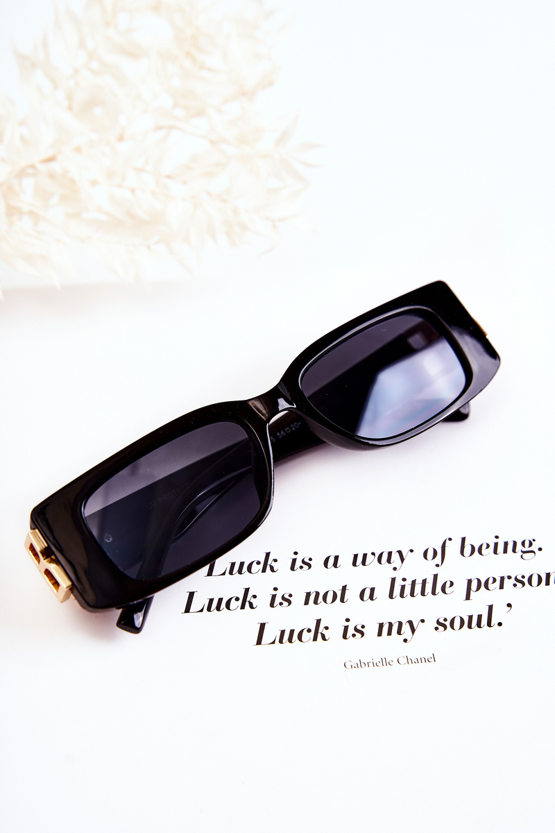 Модні сонцезахисні окуляри підходять у багатьох ситуаціях! Не тільки в літній сезон, але і взимку, коли сонячні промені відбиваються від снігу. Прямокутна модель в стилі 90-х з маленькими лінзами. Виготовлений із пластику. Скроні звужені до кінця і прикрашені золотистим елементом. Інформація виробника: окуляри поглинають шкідливі ультрафіолетові промені, 3 категорія.