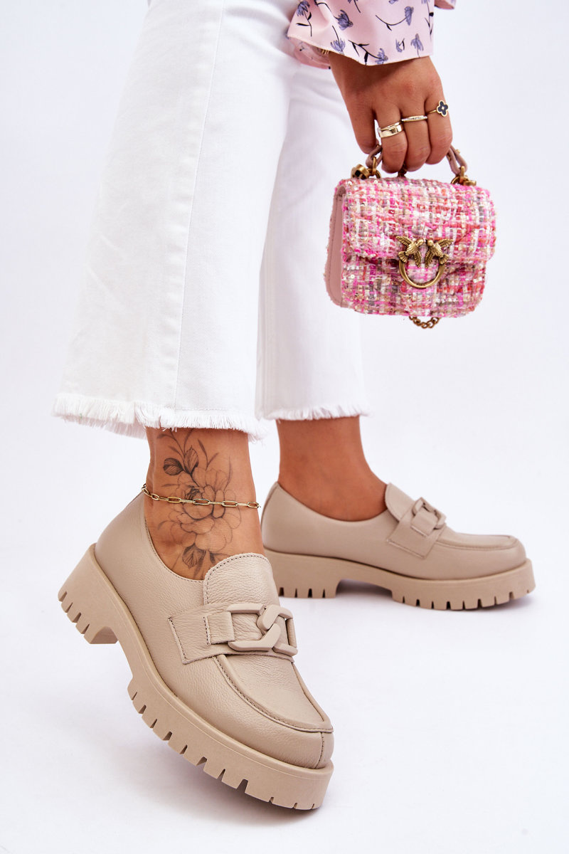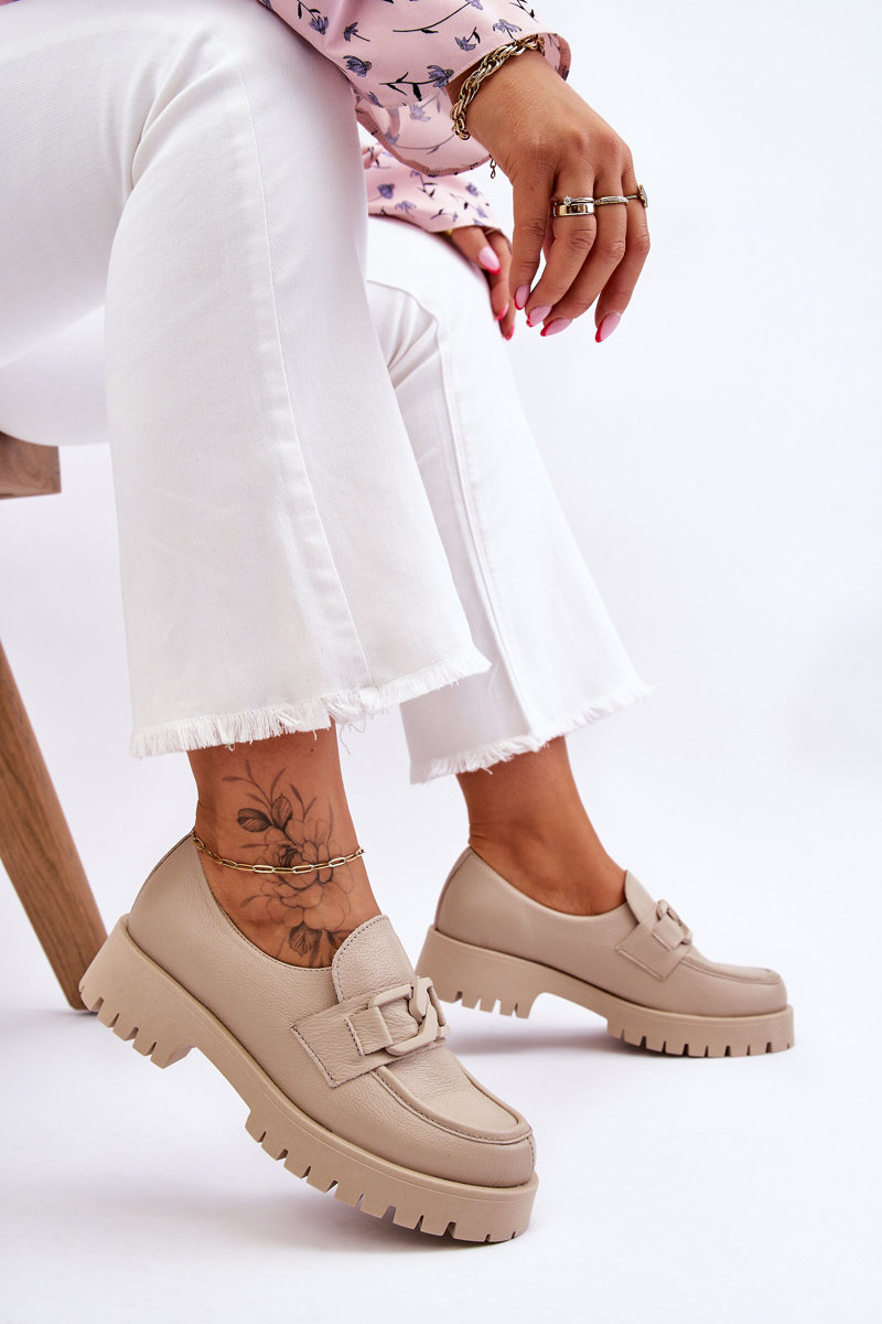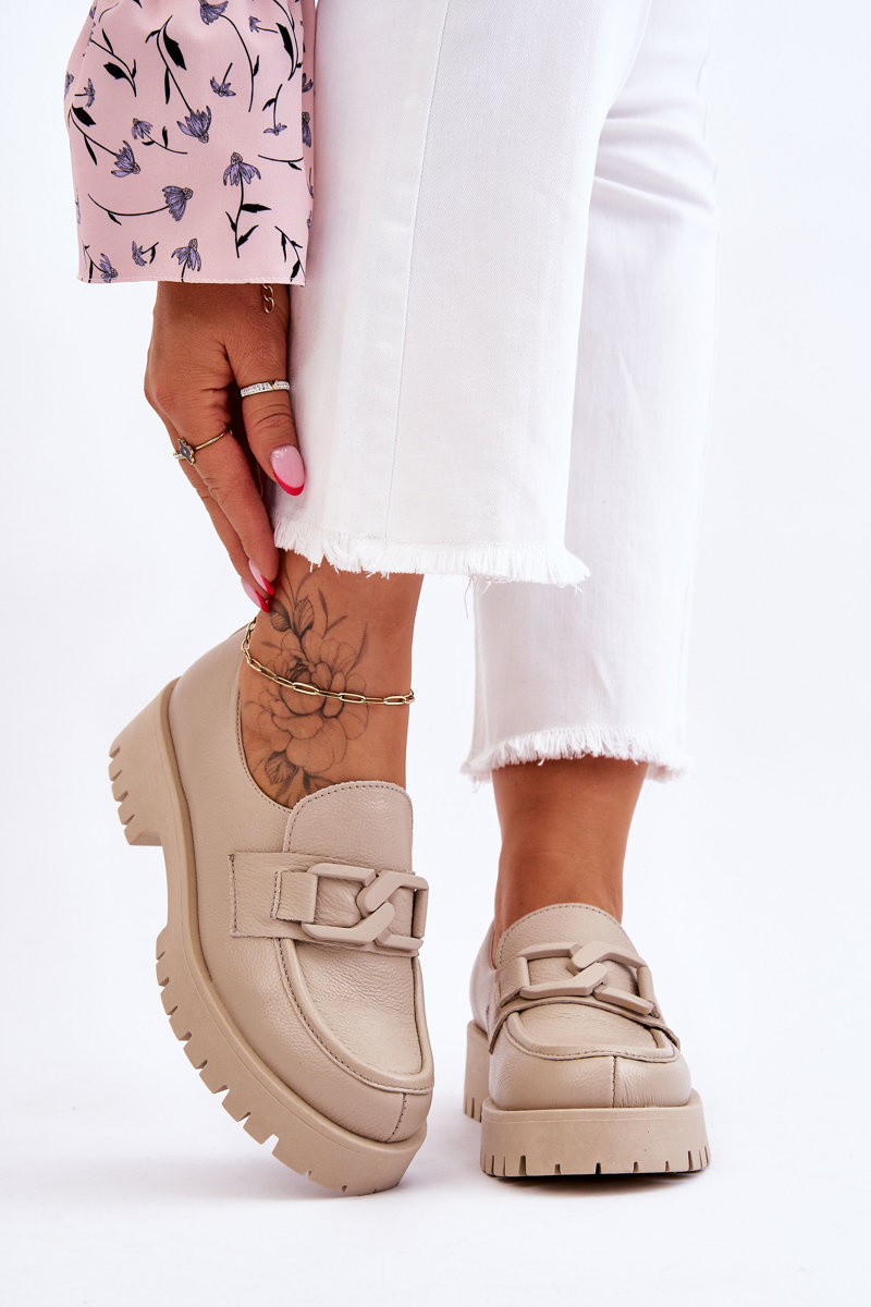 Сліпони з натуральної шкіри із закругленим носом. Вони кріпляться на масивній платформі і плоскому стійкому каблуці. Модель з високим протектором підошви. Зверху декоративний ланцюжок. Під язиком є ​​еластична гумка, завдяки якій взуття буде більш сидіти по нозі. Туфлі мають посилений каблук. Модно, зручно, зроблено з увагою до деталей - одним словом: ідеально! М'яка натуральна шкіряна устілка подбає про ваш комфорт. При виборі розміру скористайтеся таблицею розмірів.