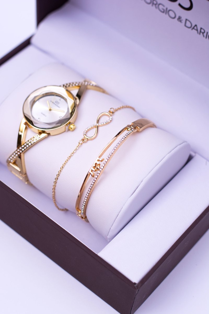 Елегантний і надзвичайно стильний комплект від Giorgio Dario. Золотий годинник, прикрашений крихітними кристалами і двома стильними браслетами. Такий набір вам точно сподобається, ідеальний набір для подарунка! Пропозиція включає все, що зображено на фото, а саме годинник, два браслети та упаковку.