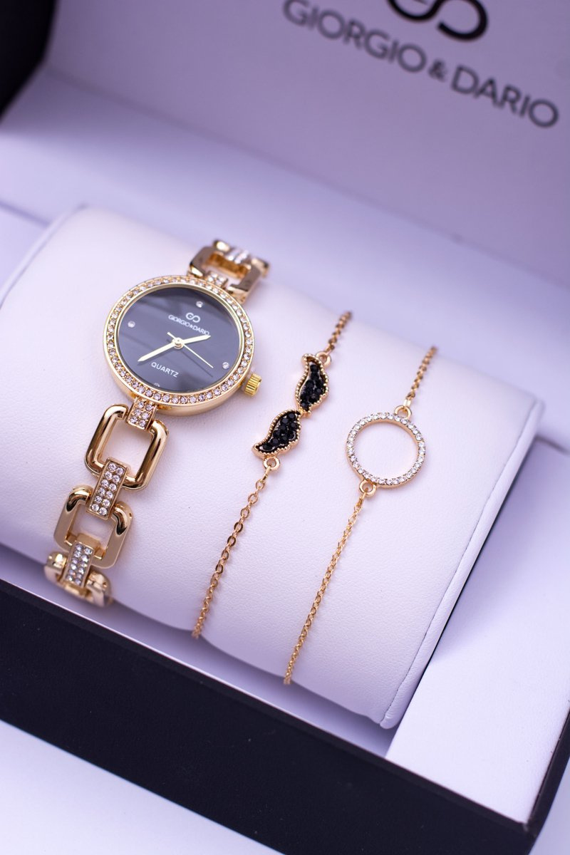 Незвичайна колекція годинників Giorgio Dario, яка ідеально підкреслить Вашу унікальність! Ця маленька коробка містить усе, що ми хочемо. Ніжна прикраса у вигляді золотого годинника з двома красивими браслетами. У пропозицію входить все, що зображено на фото, тобто годинник, браслети та упаковка.
