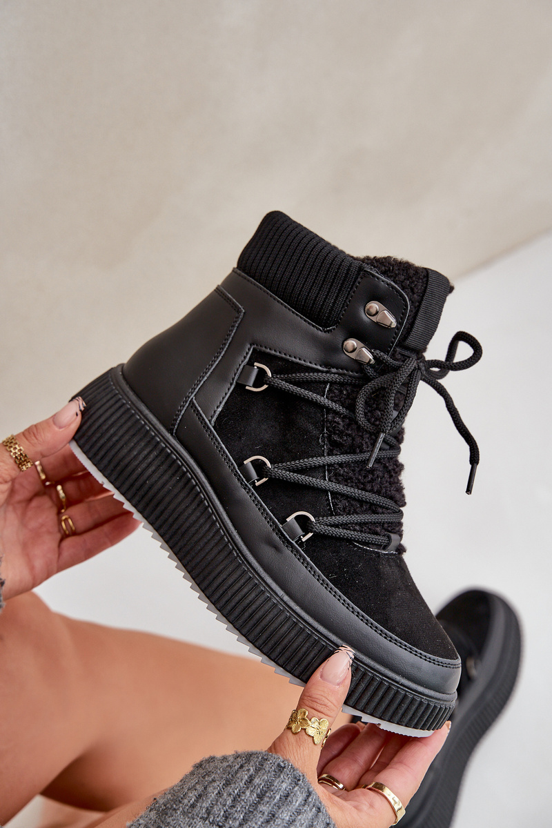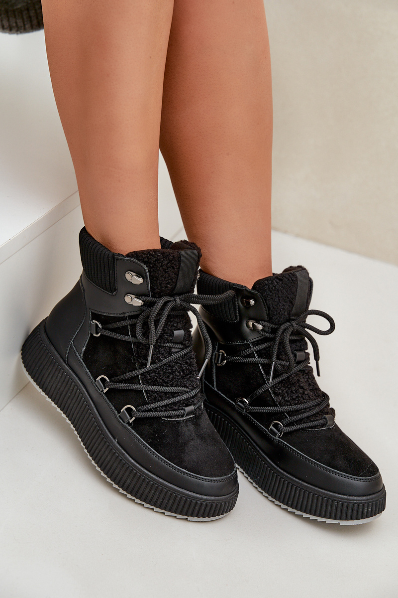 Низькі снігоступи на платформі – ідеальне взуття для зимових днів. Модель вирізняється язичком, прикрашеним м'яким овечим хутром, що надає їй затишного та стильного вигляду. Всередині утеплено взуттєвою ковдрою. Шнурівка з додатковими гачками дозволяє точно підлаштувати черевики під ногу. Функціональні, модні та зручні – ідеальні для зимових прогулянок та щоденних стилізацій. Будь ласка, зверніться до розмірної сітки при виборі розміру.