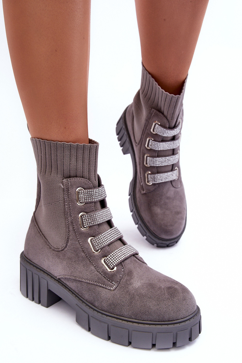 Модні чоботи - робочі підкорили серця багатьох жінок! Дана модель виконана з поєднання приємної на дотик еко замші та текстилю. Черевики сліпони, з ніжним рантом у верхній частині. Дана модель утеплена ковдрою лише на висоті стопи. Жорсткий каблук. Комплект на масивній платформі з плоским каблуком. При виборі розміру скористайтеся таблицею розмірів.