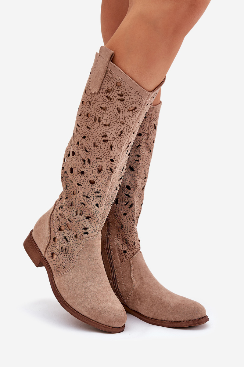 Перфоровані Чоботи На Плоскому Каблуці Бежеві HY51-176