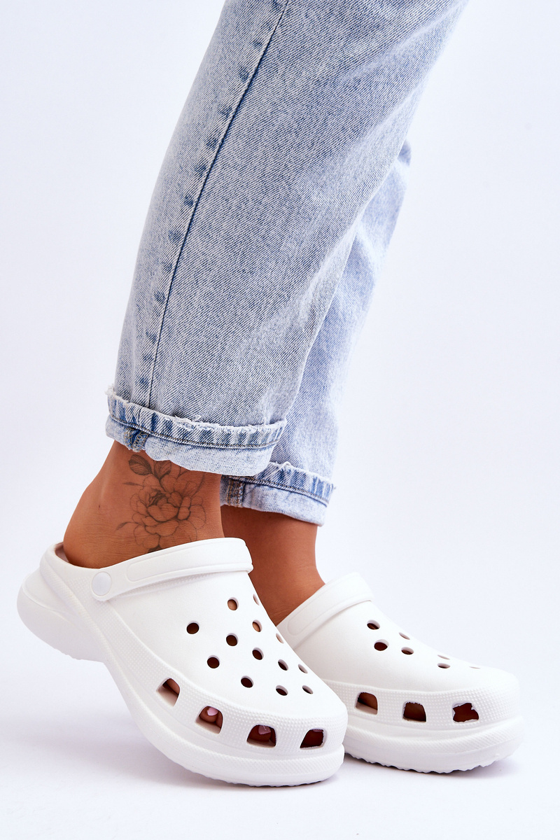 Жіночі крокси виготовлені з поролону. Вставка має делікатні виступи. Рухомий ремінь не дає стопі рухатися. Туфлі були встановлені на масивному плоскому каблуці та платформі. Ідеальна модель для роботи в саду або використання вдома замість тапочок. Отвори у верхній частині забезпечують належну вентиляцію взуття. Обираючи розмір, зверніться до таблиці розмірів.