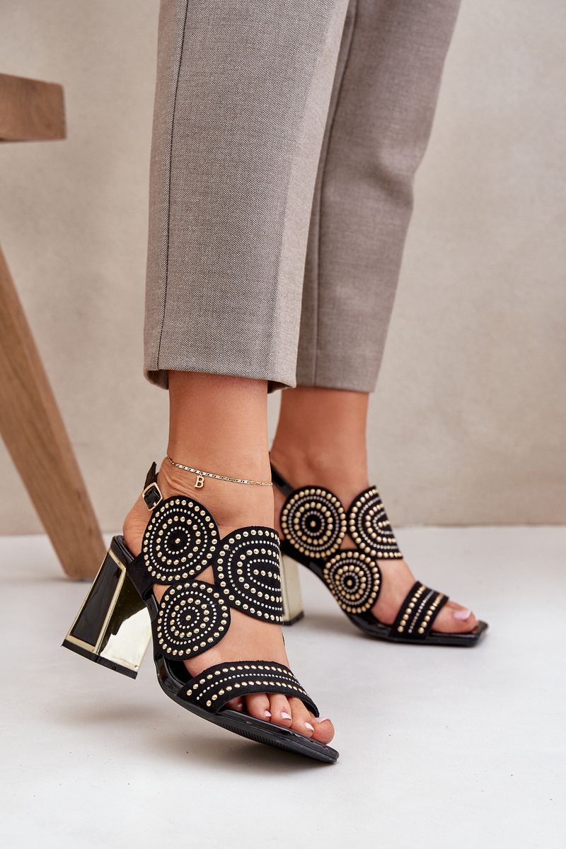 Жіночі сандалі, виготовлені з еко-замші. Встановлені на стійкому каблуці з дзеркальним золотим елементом. Декор надає їм унікального блиску та елегантності. Модель застібається на регульованому ремінці з пряжкою, що забезпечує ідеальну посадку та комфорт під час носіння. Безліч прикрас надає їм виняткової привабливості. Ці сандалі стануть ідеальним вибором для вечірніх виходів та особливих подій, поєднуючи комфорт з елегантним виглядом. Будь ласка, зверніться до розмірної сітки при виборі розміру.