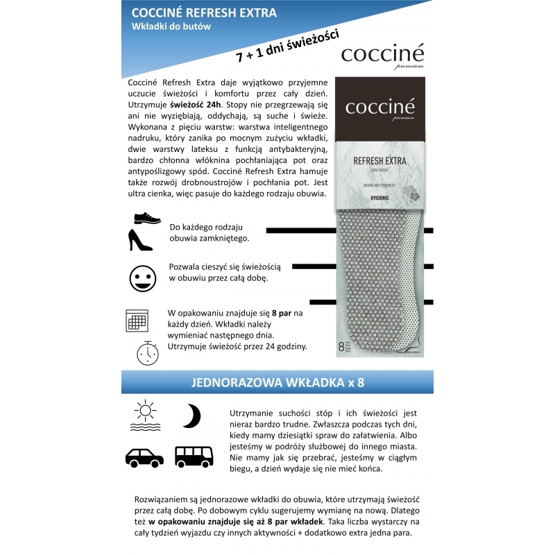 Спорт - це здоров'я! Але як щодо ніг? Під час фізичних навантажень, наприклад бігу, їх навантаження може збільшуватися до десяти разів. Зруйнована підкладка взуття призводить до болю в стопах, а сильна пітливість і набряк сприяють натиранню. Щоб забезпечити комфорт ніг у таких екстремальних умовах, потрібні рішення-рекордсмени, тобто Cocciné – експерт у складних темах. Тонка надзвичайно легка вставка з целюлозного волокна містить освіжаючі капсули з ефірними маслами, що дарує відчуття комфорту протягом дня. Ноги не перегріваються і не охолоджуються, залишаються сухими і свіжими. Нековзна підкладка утримує підніжку на місці. Вони пригнічують ріст мікроорганізмів і вбирають піт. Він тонкий, тому підходить під будь-яке взуття. Освіжаючий ефект триває 5-7 днів. Рекомендується особливо влітку. Для частої заміни - 8 пар в упаковці. Розміри на вибір: 36/38, 39/41, 42/44 - з можливістю розкрою.