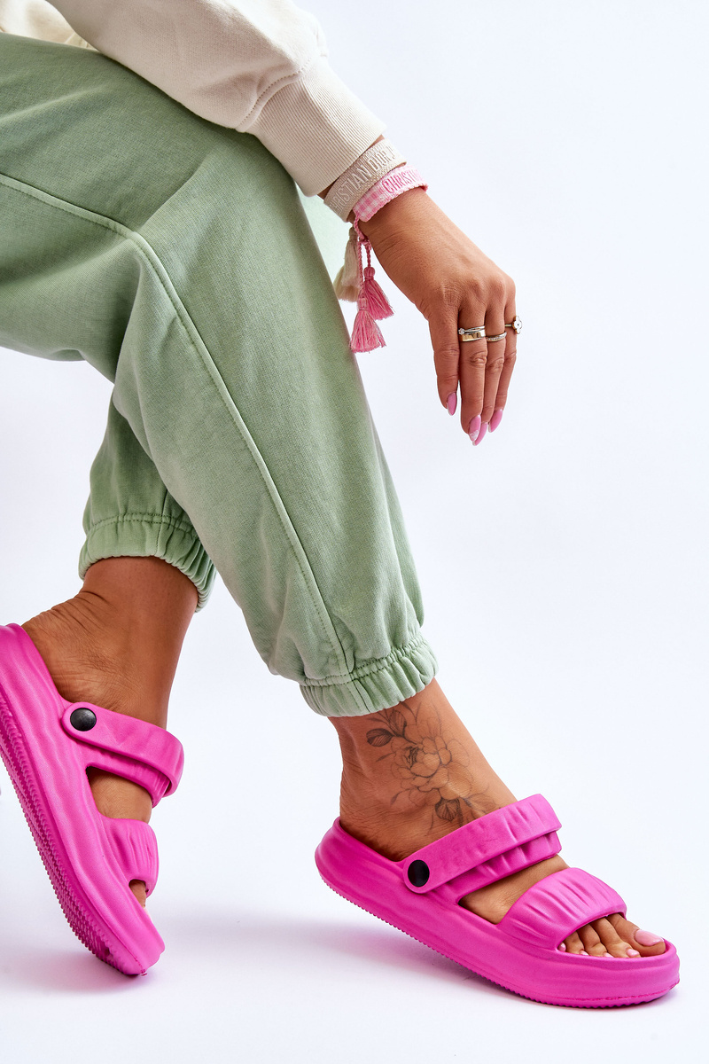 Легкі жіночі тапочки, які можна швидко змінити на босоніжки! Просто натягніть ремінь на задню частину стопи. Шльопанці виготовлені зі спіненого матеріалу. Смуги жорсткі і злегка зморшкуваті. Ця модель встановлена на масивній платформі. Вони будуть чудові в спекотні дні! Обираючи розмір, орієнтуйтеся на таблицю розмірів.